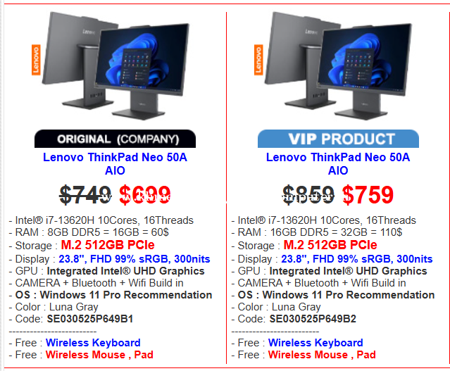 Lenovo ThinkPad Neo 50A AIO Price : $749 > $699 - Intel® i7-13620H 10Cores, 16Threads - RAM : 8GB DDR5 = 16GB = 60$ - Storage : M.2 512GB PCIe - Display : 23.8", FHD 99% sRGB, 300nits - GPU : Integrated Intel® UHD Graphics - CAMERA + Bluetooth + Wifi Build in - OS : Windows 11 Pro Recommendation - Color : Luna Gray ☎️ ទនាក់ទំនង 0950937xxxClick To Call 77 💬 Telegram : t.me/cnkcomputer93 🌐 Website: https://cnkcomputer.com/
