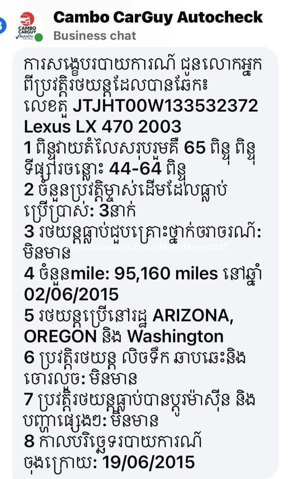 🚘 ម៉ាកឡាន : Lexus Lx 470 👉ឆ្នាំផលិត : 2003 👉Option : បេីកដំបូល memory seat បូមឡេីងចុះអេម 👉ពណ៍ : ខាងក្រៅពណ៍ស ខាងក្នុងលឿង 👉ម៉ាសុីន : V8 សាំង 👉ធានាជូនឡាន អត់បុក អត់ប្តូរពណ៍ ឯកសារម្ចាស់ដើម 💵 មានវៃដូររថយន្ត នឹងបង់ជាមួយការ៉ាស់ផ្ទាល់ 👉បង់រំលោះសុទ្ធ 100% 👉អត្រាការប្រាក់ 0.83%-1.2% 👉សិក្សាតាមអនឡាញ 👉រយះពេលកម្ចីរហូតដល់ 7ឆ្នាំ 👉កាតគ្រីដាក់ឈ្មោះអតិថិជន 👉សិក្សាត្រឹមតែ 2ថ្ងៃដឹងលទ្ធផល 🌍 សិក្សាបង់រំលោះបាន 25 ខេត្តក្រុង
