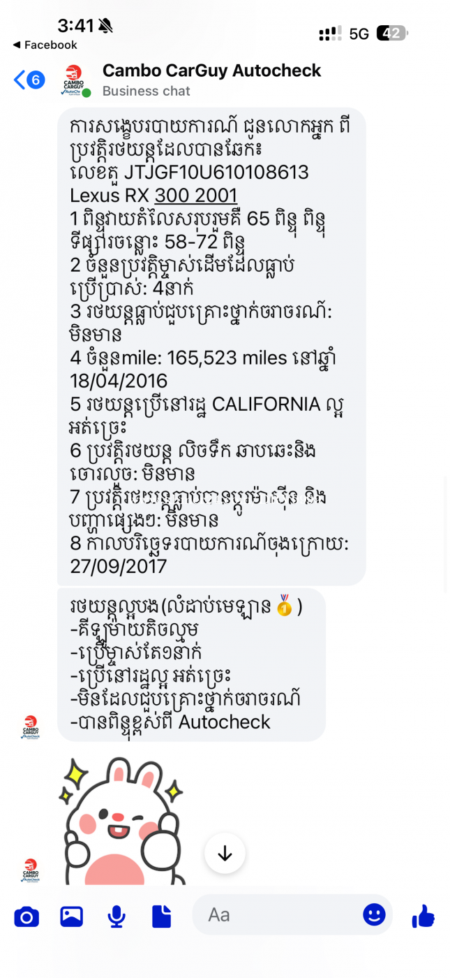 ថ្មីៗ វត្ថុបុរាណ Lexus RX300 2001 ប៉ុង1 ក្នុងលឿង ម្ចាស់ដើមទី1 2CJ-XXXX អាយុស្រីស 25ឆ្នាំហើយ សម្រស់នៅតែមិនធម្មតា ប្រភេទឡានកាលី California ធានាឡានស្អាត អត់បុក អត់ប៉ះ អត់ច្រេះ ។ 🏷️តម្លៃពិសេស ត្រឹមតែ១ម៉ឺនជាង ចរចារ ។ 📞Telegram 010288xxxClick To Call/012288xxxClick To Call https://t.me/DRV9999 ទីតាំង Location : https://maps.app.goo.gl/GnadKvG9A4RF4qGr7?g_st=com.google.maps.preview.copy