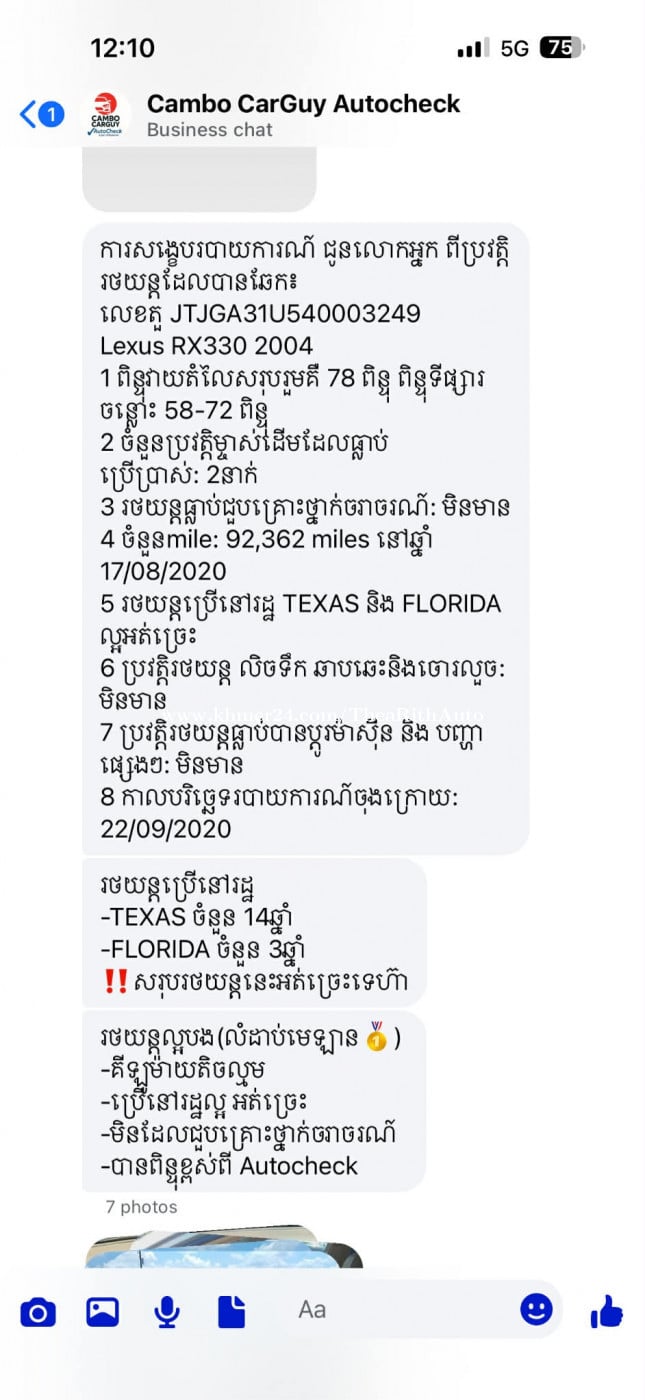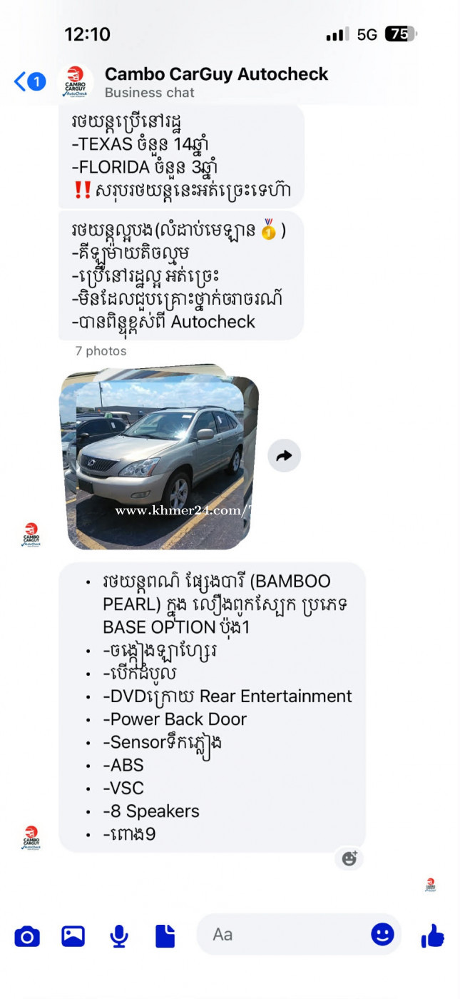 Lexus RX330 ពណ៌ផ្សែងបារី 04 ប៉ុង1 លំដាប់មេឡាន ប្រវត្តិឡានមូលអត់មានបុកប៉ះ ប្រើតិច 90000ម៉ៃនៅអាមេរិច ប្រើនៅស្រុកខ្មែរទឹមទេ 100000ម៉ៃ មាន DVD កណ្តាល ឌុយដោតដាំបាយ កាំមេរ៉ាក្រោយ ពូកនៅស្បែកហ្ស៊ីនទាំងអស់ ខ្ចៅខ្យងបាតក្រោមនៅថ្មីខ្មាំង អូតូឆែកមានទាំងអស់ តំលៃ 2 ម៉ឺនស្តើងចរចារគ្នា 015466xxxClick To Call telegram