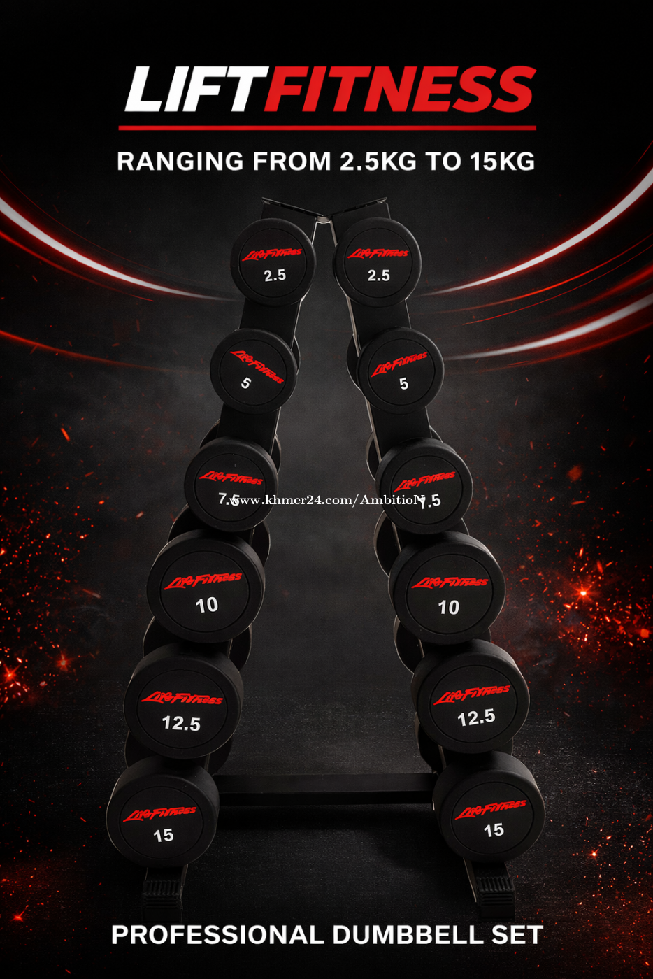 LIFT FITNESS Professional Dumbbell Set - Includes 6 pairs (12 individual dumbbells): 2.5kg, 5kg, 7.5kg, 10kg, 12.5kg, and 15kg (paired) - Premium design with black finish, branded heads, and sturdy A-frame / vertical storage rack included - Ideal for home or light commercial use – full range for progressive strength training Price: $260 USD