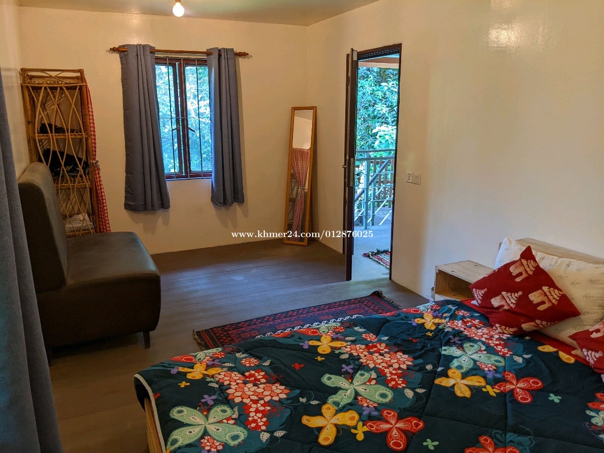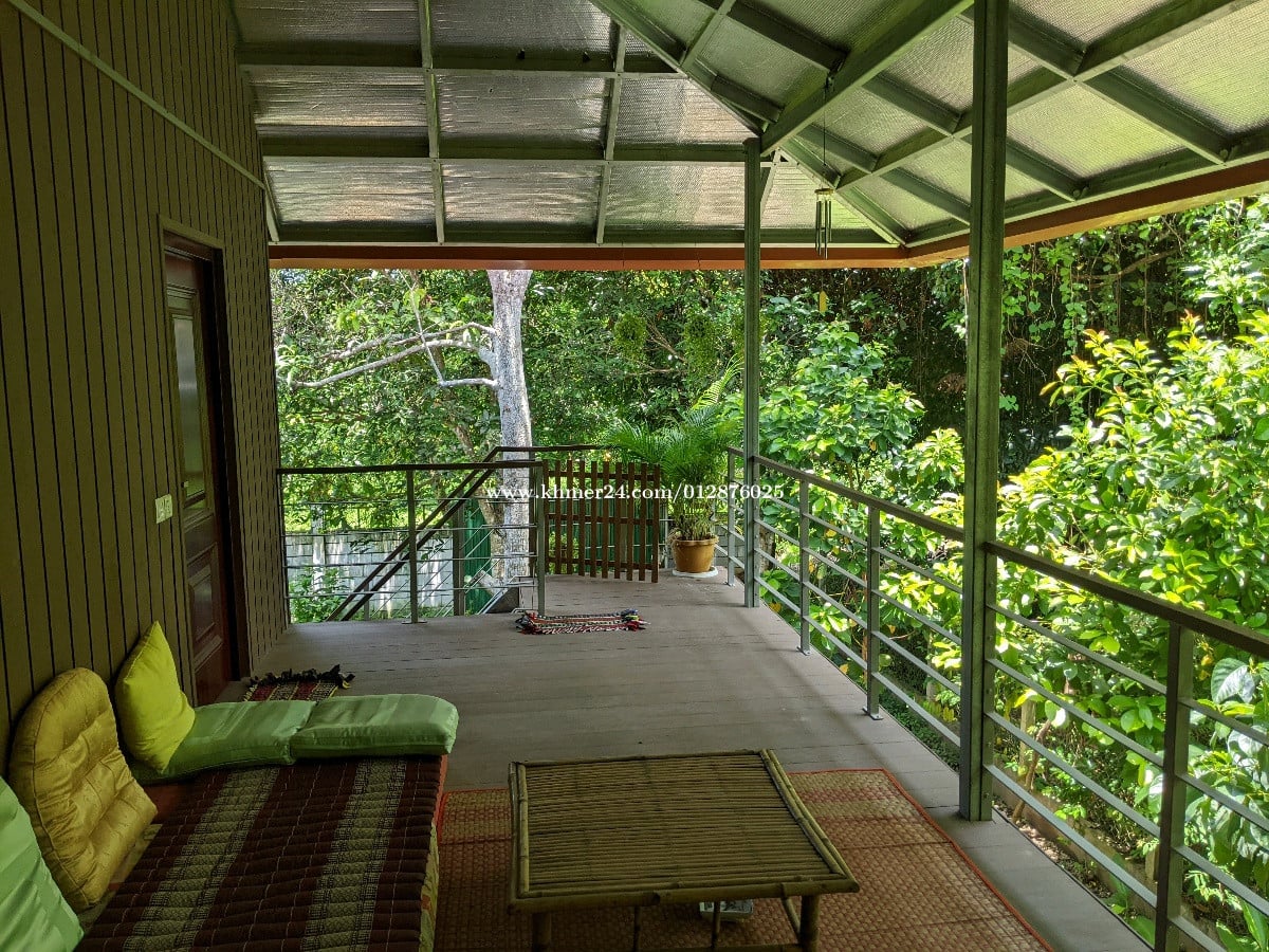 Lovely house, 110 m2, three rooms (2 big, 1 small), large terrasse with a view on the trees, kitchen-living room, one bathroom, for rent in Areyksatr (look for Ada's Hamlet Areyksatr on Google maps for location). Surrounded by lush nature, but protected by fence and gate, on a big land. Very quiet area. House is equipped (tv, stove, fridge, washing machine, fans - no aircon). Only 10 minutes river crossing on ferry from downtown Phnom Penh. Owners is a Khmer-expat couple looking for long-term and nature lovers tenants.