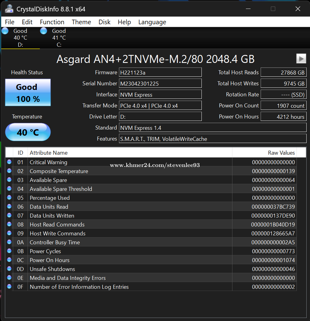 M2 nvme Asgard 2TB speed 7000mb 100% health មិនសូវបានប្រើ ចង់លក់វិញ