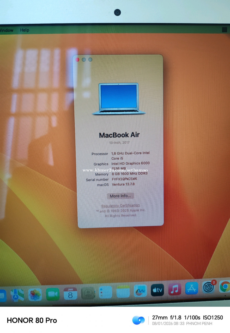 MacBook Air 2017 13" នៅថ្មីស្អាត 98% - RAM: 8GB - CPU: core i5 - SSD: 128GB - Screen 13" - Battery 🔋 Good - Wifi - Bluetooth 👍 - Overall Condition 98% new - Price: 185$ - Call - Telegram: 081233xxxClick To Call - Location: Phnom Penh