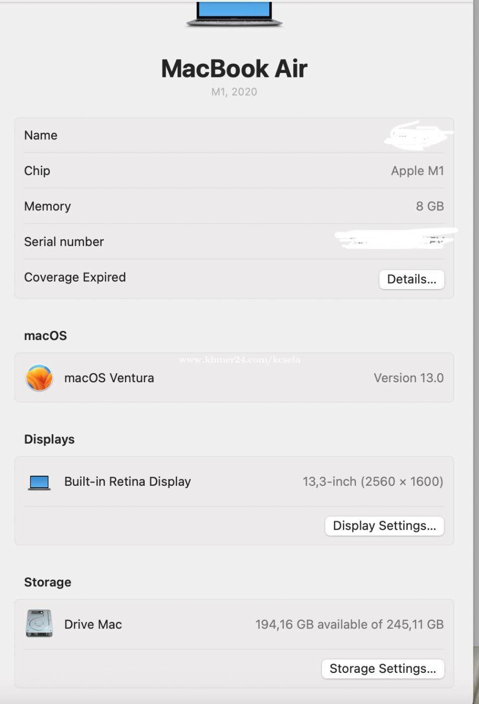 Macbook Air M1 2020 (ថ្មី 99,99%) ទិញមក មិនដែលប្រេី ទុកចោលរហូត គុណភាពថ្ម (Battery Health) 100% ចរចាបាន Spec លំអិត https://support.apple.com/en-us/111883