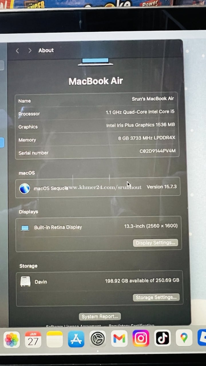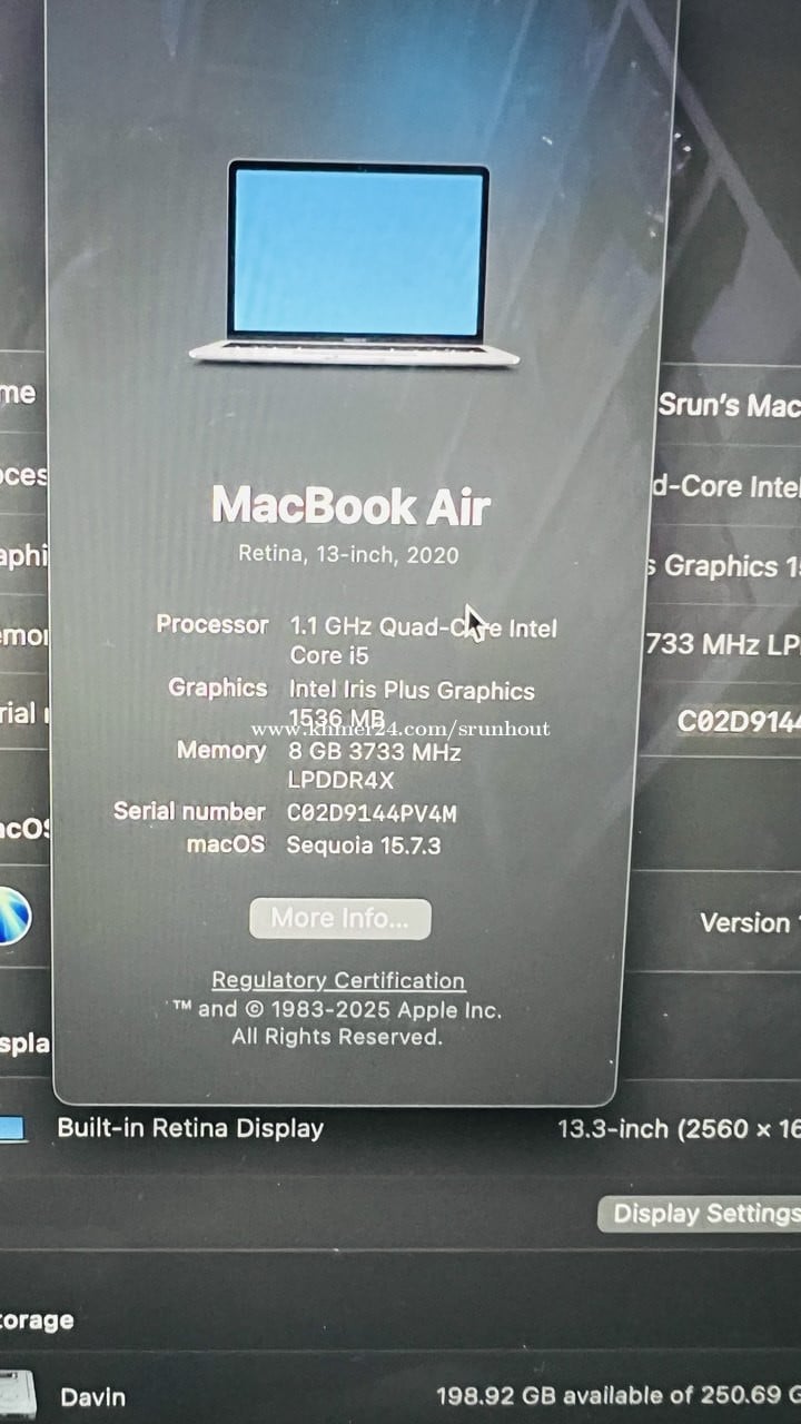 MacBook Air Retina 13-inch 2020 Space Gray From USA Processor - 1.1GHz Quad-Core Intel Core i5 Storage - 256GB SSD Memory - 8GB of 3733MHz LPDDR4X Graphics - Intel Iris Plus Graphics 15.36 MB ផ្ញើរមកពីអាមេរិក​ អត់ចេះប្រើ នៅថ្មីស្អាត 95​ %