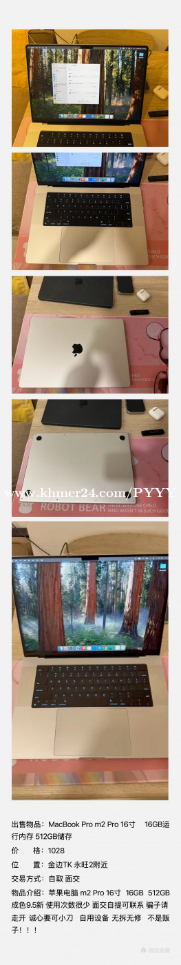 出售物品:MacBook Pro m2 Pro 16寸 16GB运行内存 512GB储存 价 格:1028 位 置:#金边 TK 永旺2附近 联系TG方式:@ZeChengMeiXue 交易方式:自取 面交 物品介绍:苹果电脑 m2 Pro 16寸 16GB 512GB 成色9.5新 使用次数很少 面交自提可联系 骗子请走开 Item for Sale: MacBook Pro m2 Pro 16-inch, 16GB RAM, 512GB Storage Price: 1028 Location: Near Aeon Mall 2, TK, Phnom Penh Contact via Telegram: @ZeChengMeiXue Transaction Method: Self-pickup/Meet-up Item Description: Apple computer m2 Pro 16-inch, 16GB RAM, 512GB storage. Condition: 9.5/10 (very new). Minimal use. Self-pickup/Meet-up only. Contact for details. Scammers please stay away.