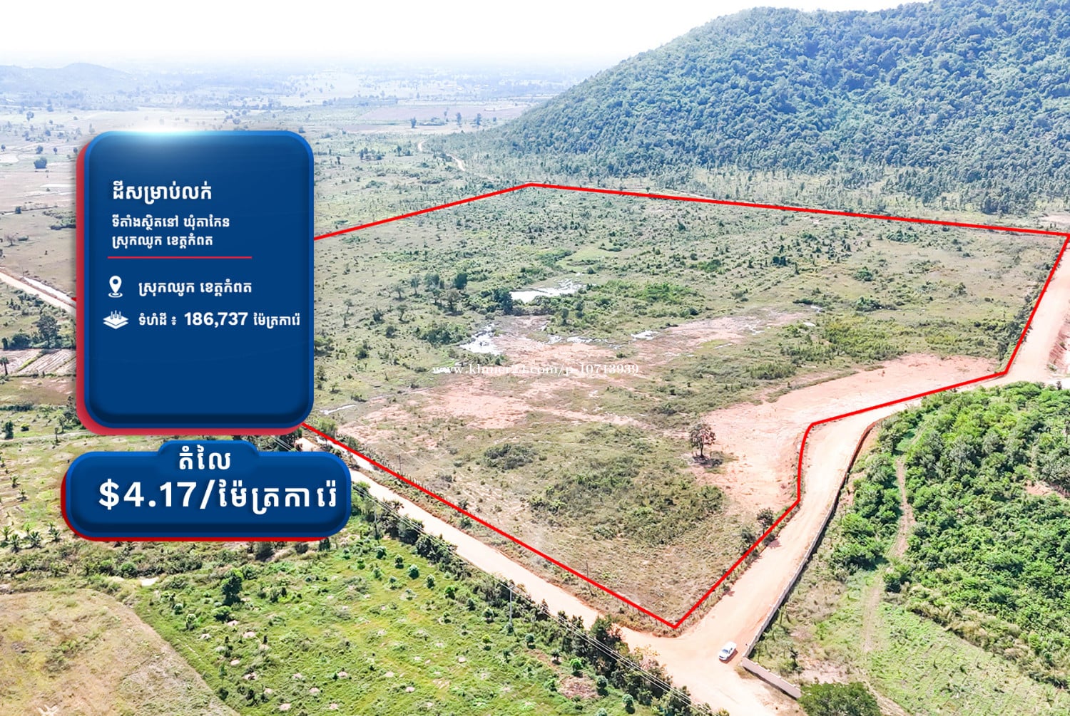 Massive Affordable Land Opportunity: 18+ Hectares Next to Mountain in Kampot Location: Takan Chhouk (Teuk Chhou area), Kampot Province – Scenic land directly adjacent to mountain with natural beauty Size: 186,737 sqm (over 18.6 hectares) – Huge plot ideal for large-scale development Title: Hard Title (secure, bank-financeable, straightforward transfer) Ideal for: Factory, warehouse, agro-processing plant, logistics facility, or industrial/agricultural project Price: Only US$4.7/sqm (Negotiable) – Ultra-low entry in 2025 market (typical Kampot land $50–300/sqm, far below urban/coastal rates) Key Selling Points Stunning mountain-adjacent setting in , Kampot's popular tourism zone – combines natural appeal with practical industrial potential. Extremely low price per sqm makes this a rare bargain for big investors seeking land banking, farming expansion, or factory setup in Cambodia's growing southern province. Vast flat-to-sloping terrain ready for customization, with strong appreciation upside as Kampot's tourism, agriculture, and infrastructure continue to boom. Hard title guarantees low-risk ownership in a province attracting new SEZs and investments. Motivated seller – perfect for serious buyers or companies eyeing cost-effective expansion in Cambodia. Contact immediately for site visit and negotiation! ឱកាសដីធំតម្លៃថោក៖ ជាង ១៨ ហិកតា ជាប់ភ្នំនៅកំពត • ទីតាំង៖ តាកែន ជួក ខេត្តកំពត – ដីជាប់ភ្នំដោយផ្ទាល់ មានធម្មជាតិស្រស់ស្អាត • ទំហំ៖ ១៨៦,៧៣៧ ម៉ែត្រការ៉េ (ជាង ១៨.៦ ហិកតា) – ដីធំទូលាយសម្រាប់គម្រោងធំ • ប្លង់៖ ប្លង់រឹង (សុវត្ថិភាពខ្ពស់ ខ្ចីធនាគារបាន ផ្ទេរងាយ) • ស័ក្តិសមសម្រាប់៖ រោងចក្រ ឃ្លាំង រោងចក្រកែច្នៃកសិផល មជ្ឈមណ្ឌលដឹកជញ្ជូន ឬគម្រោងឧស្សាហកម្ម/កសិកម្ម • តម្លៃ៖ ត្រឹម ៤.៧ ដុល្លារ/ម៉ែត្រការ៉េ (ចរចាបាន) – តម្លៃទាបបំផុតក្នុងទីផ្សារ ២០២៥ (ដីកំពតជាធម្មតា ៥០–៣០០ ដុល្លារ/ម៉ែត្រការ៉េ) ចំណុចលេចធ្លោ • ទីតាំងស្រស់ស្អាតជាប់ភ្នំនៅ តំបន់ទឹកជ្រៅ កំពត ដែលជាតំបន់ទេសចរណ៍និងទន្លេល្បី – រួមបញ្ចូលធម្មជាតិជាមួយសក្តានុពលឧស្សាហកម្ម • តម្លៃថោកខ្លាំងក្នុងមួយម៉ែត្រការ៉េ ជាឱកាសកម្រសម្រាប់វិនិយោគិន រក្សាដីទុក ពង្រីកកសិកម្ម ឬសាងសង់រោងចក្រ • ដីធំទូលាយ មានសក្តានុពលតម្លៃកើនខ្ពស់ជាមួយកំណើនទេសចរណ៍ កសិកម្ម និងហេដ្ឋារចនាសម្ព័ន្ធកំពត • ប្លង់រឹងធានាវិនិយោគសុវត្ថិភាពនៅខេត្តកំពុងទាក់ទាញតំបន់សេដ្ឋកិច្ចពិសេសថ្មីៗ ម្ចាស់ចង់លក់លឿន – ស័ក្តិសមសម្រាប់អ្នកទិញ ឬក្រុមហ៊ុនពង្រីកអាជីវកម្មតម្លៃទាបនៅកម្ពុជា។ ទាក់ទងឥឡូវសម្រាប់មើលដីនិងចរចា!
