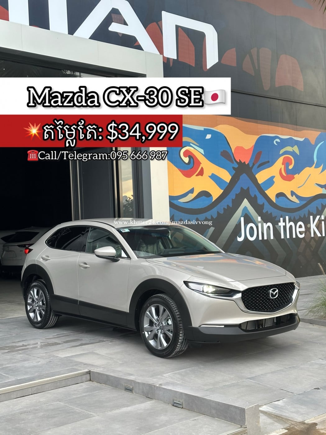 >ទំនាក់ទំនងផ្នែកលក់Call:095666xxxClick To Call >Telegram តេឡេក្រាម៖https://t.me/SivVongMazda -Mazda CX-30 SE តម្លៃត្រឹមតែ:$34,999 -ចូលរួមមុនចាប់ពី $3,500ឡើងទៅសិក្សាតែ 2ថ្ងៃសម្រាប់ការបង់រំលស់ -ផលិតនៅប្រទេសជប៉ុនផ្ទាល់ដឹកពីជប៉ុនមកផ្ទាល់🇯🇵 +ផ្ដល់ជូនការធានា3ឆ្នាំ ប្ដូរប្រេងជូនដោយឥតគិតថ្លៃ 4ដង💥 +ទីតាំងអគារតាំងរថយន្តMazda មានជ័យស្ថិតតាមបណ្ដោយផ្លូវ60ម៉ែត្រក្បែរAeon3 #mazdacambodia #MazdaCX30