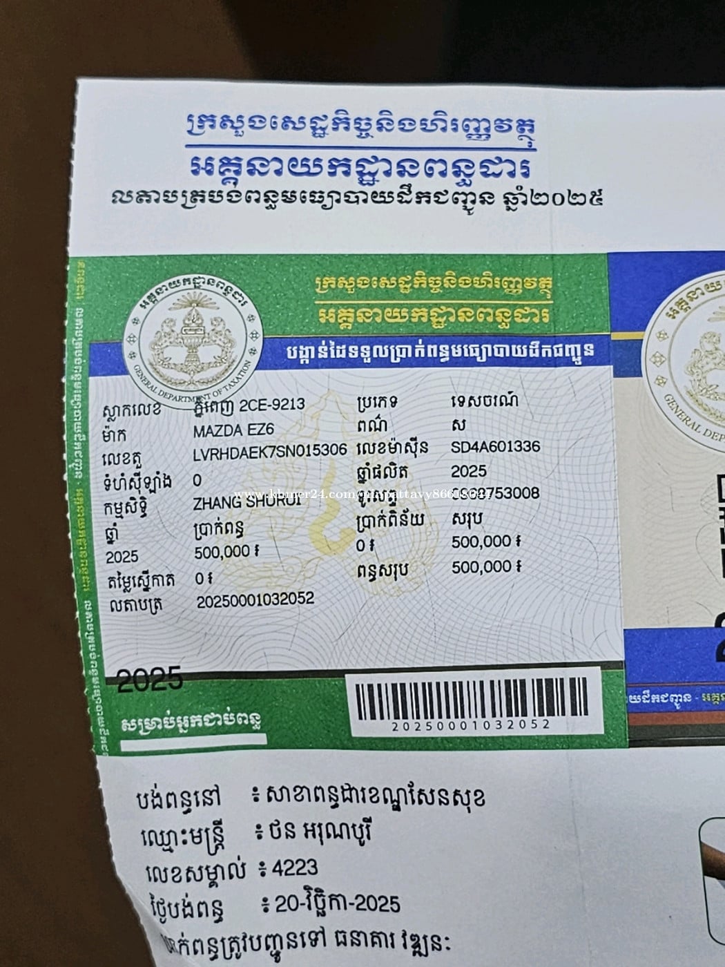 Mazda full option 2025 1 បង់ពន្ធផ្លូវរួចរាល់ 2 អ៊ុតស្គុត និង UVរួចរាល់ 3 ទឹកថ្នាំស៊ីនមួយជុំ 4 ឡានប្រើប្រាស់ក្នុងក្រុងភ្នំពេញ 5 សាក់ថ្មបាន 600 គីឡូម៉ែត្រ 6 ម្ចាស់ដើមផ្ទាល់