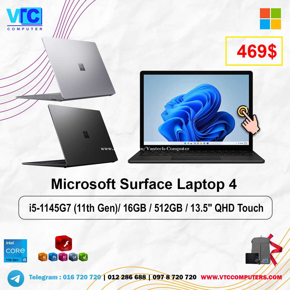 Microsoft Surface Laptop 4 (from USA) Color : Ice Blue CPU : Intel Core i5-1145G7 -2.6Ghz (11th Gen) Memory : 16GB LPDDR4 Storage : 512GB SSD PCIe Screen size : 13.5" QHD Multi-Touch (2256 x 1504) VGA : Intel IrisXe Graphics Camera : User-Facing: 1080p Wireless Wi-Fi 6: 802.11ax compatible, Bluetooth 5.0 Ports : 1 x USB-C® 1 x USB-A 3.5 mm headphone jack 1 x Surface Connect port Battery : 58 Wh Weight : 0.8g ----------------- - Surface Laptop Go . $269 ( Color : silver) i5 -1035G1 (10th Gen)/ RAM : 16GB/ 256GB/ Screen : 12.4 " FHD+ - Surface Laptop 3 . $310 ( Colors: Matte Black, Cobalt Blue, Silver) i5-1035G7-1.2Ghz (10th Gen)/ RAM : 8GB / 256GB / 13.5" 2K Touch - Surface Laptop 3 . $349 ( Colors: Matte Black, Cobalt Blue, Silver) i5-1035G7-1.2Ghz (10th Gen)/ RAM 16 GB / 256GB / 13.5" 2K Touch - Surface Laptop 3 . $399 ( Colors: Matte Black, Cobalt Blue, Silver) i7-1065G7 (10th Gen)/ RAM 16GB / 256GB / 13.5" 2K Touch - Surface Laptop 4 . $419 ( Colors: Matte Black, Silver) i5-1145G7 -2.6Ghz (11th Gen)/ Ram 16GB / 256GB / 13.5" QHD Multi-Touch - Surface Laptop 4 . $459 ( Colors: Matte Black, Silver) i5-1145G7 -2.6Ghz (11th Gen)/ Ram 16GB / 512GB / 13.5" QHD Multi-Touch - Surface Laptop 4 . $499 ( Colors: Matte Black, Silver) i7-1185G7 -3.0Ghz (11th Gen)/ RAM 16GB / 256GB / 13.5" QHD Multi-Touch - Surface Laptop 5 . $499 ( Colors: Matte Black) i5- 1245U (12th Gen)/ RAM 16GB / 256GB / 13.5" QHD Multi-Touch - New Keyboard surface Pro in box (Black ) $95 - New Keyboard surface Pro in box (Gray) $95 - New Keyboard surface Pro in box (Red ) $95 - New Pen surface Pro (Blue, Red , Silver, Black ) - $79 VANTECH COMPUTERS Telegram : 012286xxxClick To Call (Cell Card)/ 016720xxxClick To Call (Smart )/ 0978720xxxClick To Call (Metfone)/ WhatsApp : 011286xxxClick To Call Telegram : https://t.me/+AEgivSId2VYyMmE1 Link seller: https://t.me/VTCcomputer អាស័យដ្ឋាន ៖ នៅផ្លូវកម្ពុជាក្រោម (128St), ផ្ទះលេខ 478E0, ខាងកើតស្តុបDN 100m ខាងស្តាំដៃ, រាជធានីភ្នំពេញ។ Address : #478 Kampuchea Krom (128st.,), Sangkat Metapheap, Khan 7 Makara, Phnom Penh, Cambodia. Location : https://maps.app.goo.gl/sjjuRKPnEyCiBoDN9 Website: www.vtccomputers.com