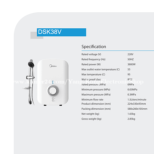 •Minimum Flow Rate: 1.5L/1min • Voltage: 220V • Power: 3800W • Product Dimension: 224 x 330 x 93mm • Packing Dimension: 580 x 260 x 105mm • Splash proof IP25