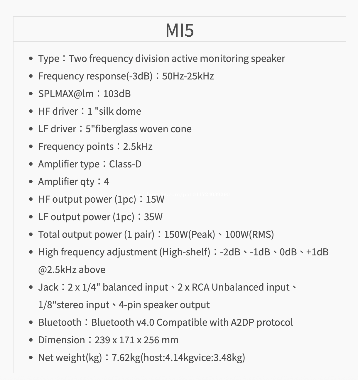 * Type:Two frequency division active monitoring speaker * Frequency response(-3dB):50Hz-25kHz * SPL MAX@lm:103dB * HF driver:1 "silk dome * LF driver:5"fiberglass woven cone * Frequency points:2.5kHz * Amplifier type:Class-D * Amplifier qty:4 * HF output power (1pc):15W * LF output power (1pc):35W * Total output power (1 pair):150W(Peak)、100W(RMS) * High frequency adjustment (High-shelf):-2dB、-1dB、0dB、+1dB @2.5kHz above * Jack:2 x 1/4" balanced input、2 x RCA Unbalanced input、1/8"stereo input、4-pin speaker output * Bluetooth:Bluetooth v4.0 Compatible with A2DP protocol * Dimension:239 x 171 x 256 mm * Net weight(kg):7.62kg(host:4.14kgvice:3.48kg)