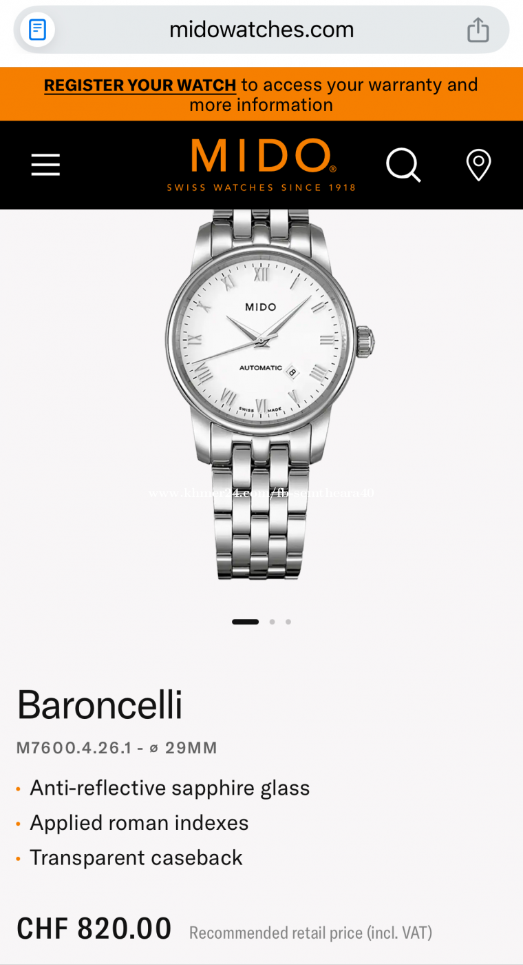 Mido Ladies Baroncelli M76004xxxClick To Call Condition: Pre-Owned ( like new ) Full set: Box and Paper Case diameter: 29mm Movement: Automatic Case material: Stainless steel Warranty: 1 year Retail price: 850$ - 1000$ Our price: 350$ For more info: inbox us ๐ฅ or call 099340xxxClick To Call Telegram: https://t.me/horologer_007 Channel: https://t.me/camwatchesstore TikTok: Mr.Horologer Page: Camwatches Store