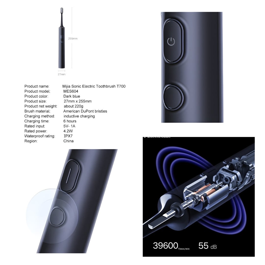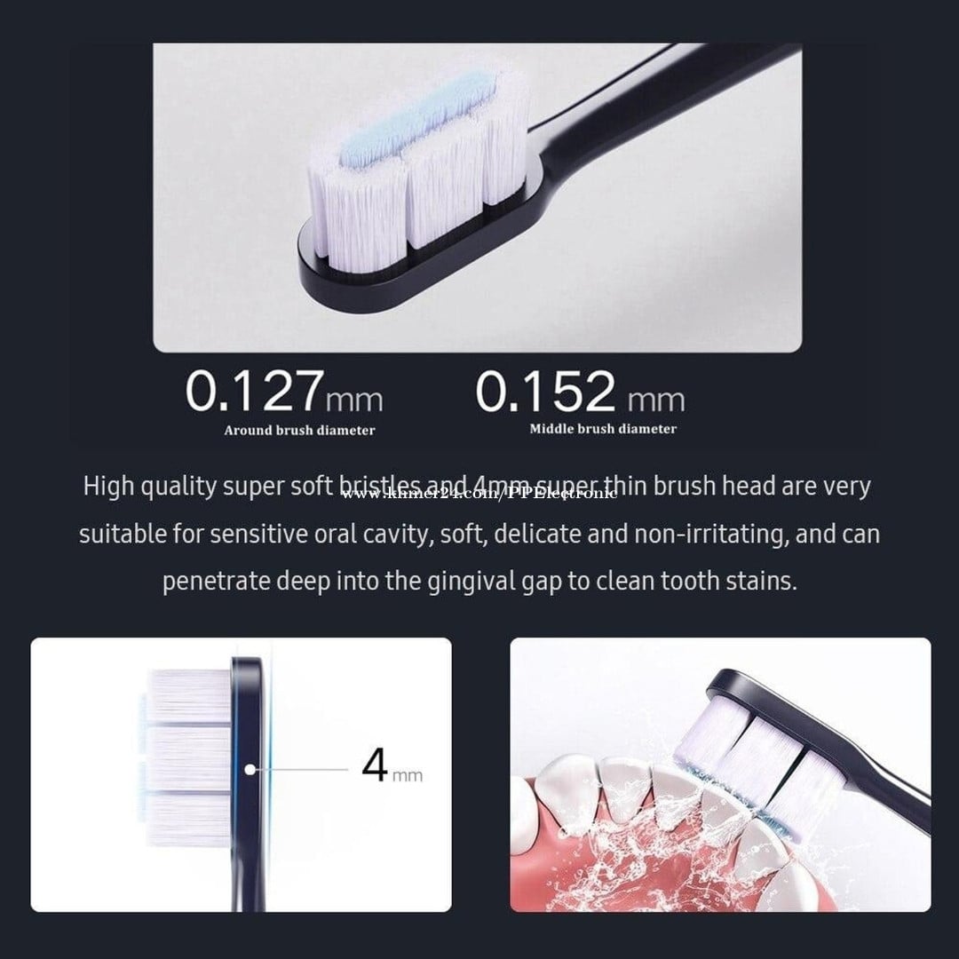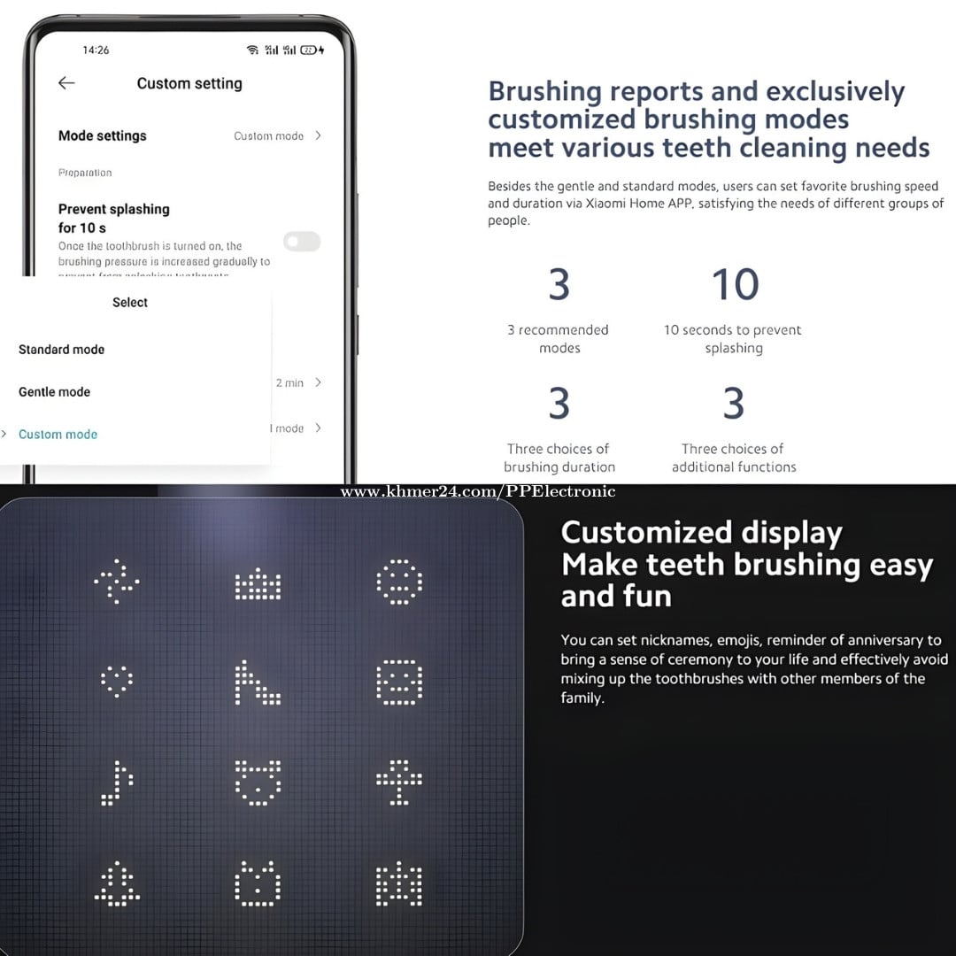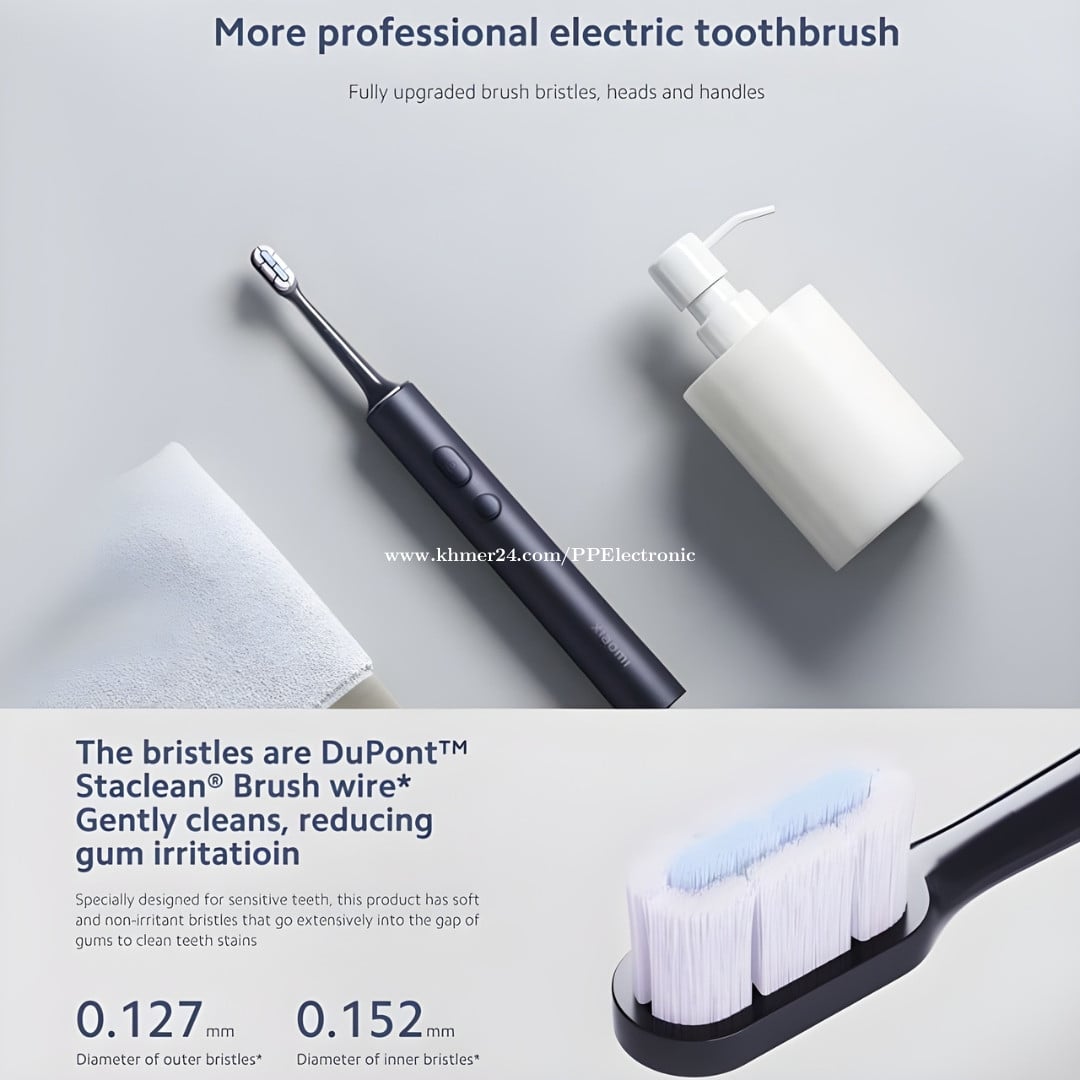 Mijia Electric Toothbrush T700 Toothbrush Head 2-Pack គឺជាច្រាសដុសធ្មេញអគ្គិសនីដែលរចនាបទឡើងមានរាងតូចស្រាលជាមួយនឹងការសាកថ្មឥតខ្សែ 360° កាន់តែងាយស្រួលក្នុងការប្រើប្រាស់ មានអេក្រង់ LED ឆ្លាតវៃដែលអាចប្រើប្រាស់ជាមួយ App ដើម្បីសម្អាតធ្មេញ សសៃច្រាសទន់ជួយការពារអញ្ចាញធ្មេញមិនអោយងាយរលាក រចនាឡើងជាពិសេសសម្រាប់អ្នកដែលមានធ្មេញងាយប្រតិកម្ម ងាយស្រួលក្នុងការប្រើប្រាស់ប្រចាំថ្ងៃ 💲តម្លៃត្រឹមតែ 79$ ប៉ុណ្ណោះ 🛡ធានារយៈពេល 6 ខែ 🛵ដឹកជញ្ជូនឥតគិតថ្លៃទូទាំងប្រទេស 🔘លក្ខណៈពិសេស ☑️មានក្បាលច្រាសដុសធ្មេញ 2 ភ្ជាប់មកជាមួយស្រាប់ងាយស្រួលក្នុងផ្លាស់ប្ដូរ ☑️សសៃច្រាសស្តើងត្រឹមតែ 4mm ងាយស្រួលក្នុងការសម្អាតអាចបត់បែនបានយ៉ាងងាយស្រួល ☑️សរសៃច្រាសច្រើន ល្អិត និងមានរាងប៉ោង ដើម្បីជួយឲ្យការសម្អាតធ្មេញបានមានប្រសិទ្ធភាពជាងមុន ☑️សរសៃច្រាសខាងក្រៅត្រឹមតែ 0.127mm ☑️សរសៃច្រាសខាងក្នុងត្រឹមតែ 0.152mm ☑️មានអេក្រង់ LED ឆ្លាតវៃសម្រាប់បង្ហាញពីរបៀបបញ្ជា និងថាមពលថ្ម ☑️ប៊ូតុងធ្វើពីលោហៈ ប្រើប្រាស់បានយូរ និងមានគុណភាពខ្ពស់ ☑️ការរចនាផ្ទៃនៃដងច្រាសមិនស្មើរគ្នាធានាបាននូវការពារពីការរអិល ☑️កម្រិតរំញ័រដល់ទៅ 45°ជុំវិញ និងនូវក្រោមអញ្ចាញធ្មេញរអាចសម្អាតសំណល់អាហារ និងធូលីទន់ៗចេញបានយ៉ាងងាយ ☑️មាន Sensor ដោយស្វ័យពេលដែលកម្រិតរំញ័រខ្លាំងពេកពេលប្រើប្រាស់ ☑️ម៉ូទ័រ Brushless Sonic កម្លាំងសម្អាតខ្ពស់ និងសំឡេងទាប ☑️ថាមពលម៉ូទ័រ 39600 ដង/នាទី ☑️កម្រិតសំឡេងទាបត្រឹមតែ 55dB តែប៉ុណ្ណោះ ☑️ការសាកថ្មឥតខ្សែ 360°កាន់តែងាយស្រួល ☑️ថាមពលថ្មធំប្រើបានដល់ទៅ 24 ថ្ងៃ អស់បារម្ភក្នុងការប្រើប្រាស់ ☑️សមត្ថភាពថ្មធំដល់ទៅ 1050mAh ☑️មានប្រព័ន្ធការពារជម្រាបទឹម IPX7 អាចលាងសម្អាតបានយ៉ាងងាយស្រួល ☑️មាន App Xiaomi Home ដែលបំពេញតម្រូវការ