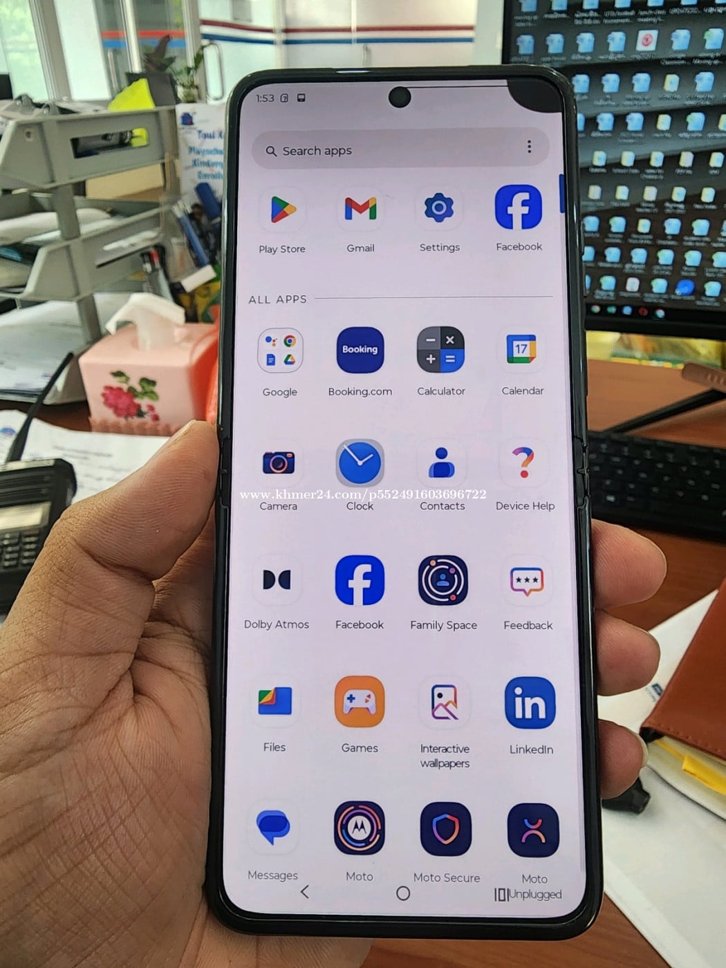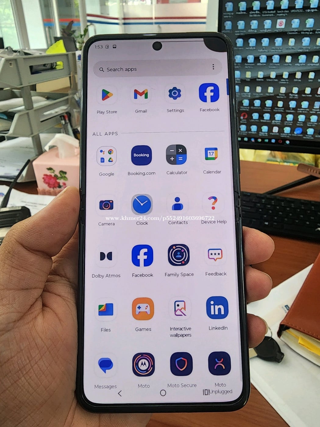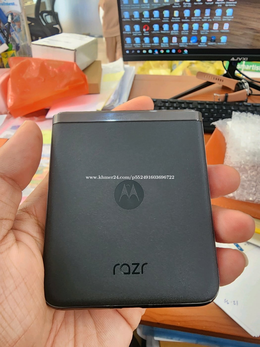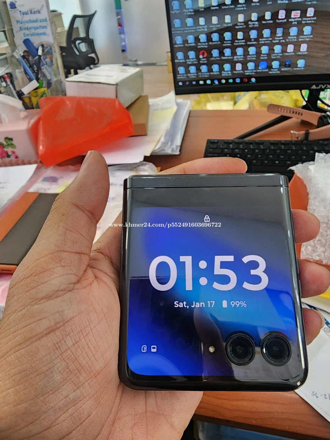Motorola Razr 40 Ultra-Sim 1+E-sim USA Ram 8G+8G Memory 256G Snapdragon 8+ Gen 1 5G ជាប្រភេទបត់ ជាំកែងខាងស្តាំបន្តិច នឹងឡាញខ្មៅ ការប្រើប្រាស់គ្មានបញ្ហា អេក្រង់ក្រៅធំល្អ ជាំក្បែរកាំមេរាបន្តិច - តេឡេក្រាម 0965555xxxClick To Call ទីតាំងនៅជិតកាំកូរ លើផ្លូវម៉ុងឬទ្ធី-178$ ចរចារ