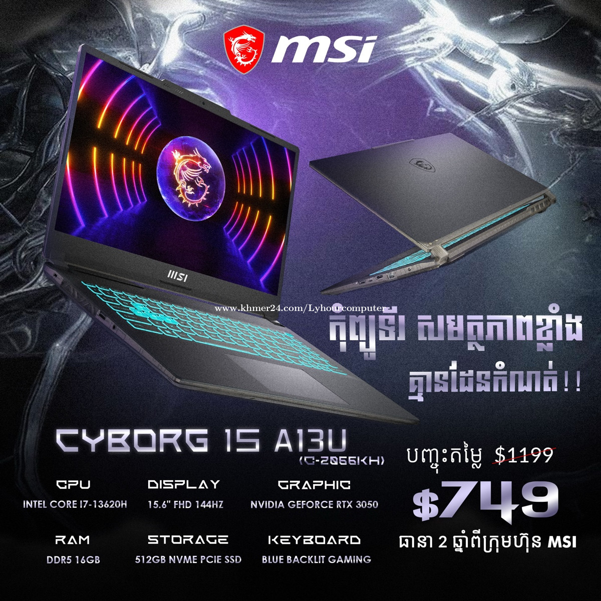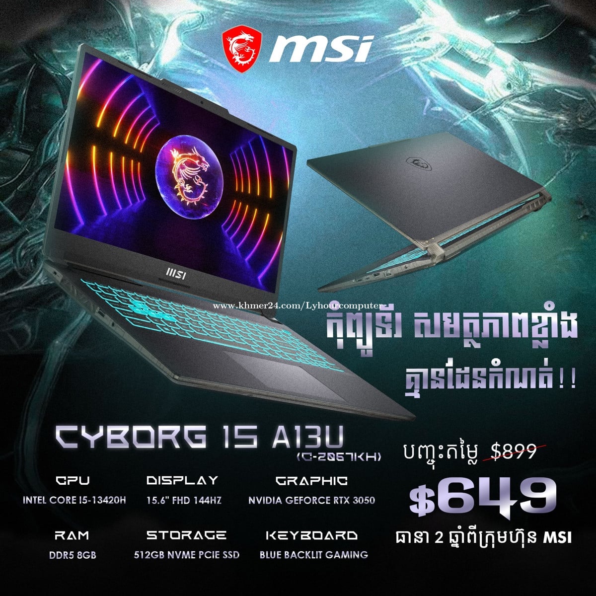 ចូលស្តុកវិញហើយ 649$ នឹង 749$😍😍 *MSI Cyborg 15 A13UC-2066KH New -CPU Intel i7-13620H (16CPUs) -RAM 16GB DDR5 -SSD M2 PCIE 512GB -VGA Intel UHD Graphics -VGA NVIDIA RTX 3050 4GB -Screen FHD IPS 15.6" 144Hz -Keyboard Light Blue Gaming 💙 -Windows License 11✔️ @តម្លៃមហាពិសេស 849$ ចុះសល់ 749$ 🐉 *MSI Cyborg 15 A13UC-2067KH Gaming New -CPU Intel Core i5-13420H -RAM 8GB DDR5 -SSD M2 PCIE 512GB -VGA Intel UHD Graphics -VGA NVIDIA RTX 3050 4GB -Screen FHD IPS 15.6" 144Hz -Keyboard Light Blue Gaming 💙 -Color : Translucent Black -Windows License 11✔️ @តម្លៃមហាពិសេស 749$ ចុះសល់ 649$ 🐉 -ថ្មីកេស១០០% ធានាជូន២ឆ្នាំ +ដំឡើងកម្មវិធីជូនដោយឥតគិតថ្លៃរយះពេល២ឆ្នាំ✅ *សេវាដឹកជញ្ជូនឥតគិតថ្លៃ២៥ខេត្តក្រុង✅ *ហាងបើកចាប់ពីម៉ោង8:00AM ដល់7:00PM 🤞 -អាស័យដ្ឋាន: ខាងក្រោយពេទ្យលោកសង្ឃ500mឬហួសទីក្រុងអាំងឈ័រ50m ផ្លូវ150 ផ្ទះ246a សង្កាត់ទឹកល្អក់២ ខណ្ឌទួលគោក រាជធានីភ្នំពេញ———————————————————————— លេខទំនាក់ទំនង »» 077 80 4444 | 016941xxxClick To Call