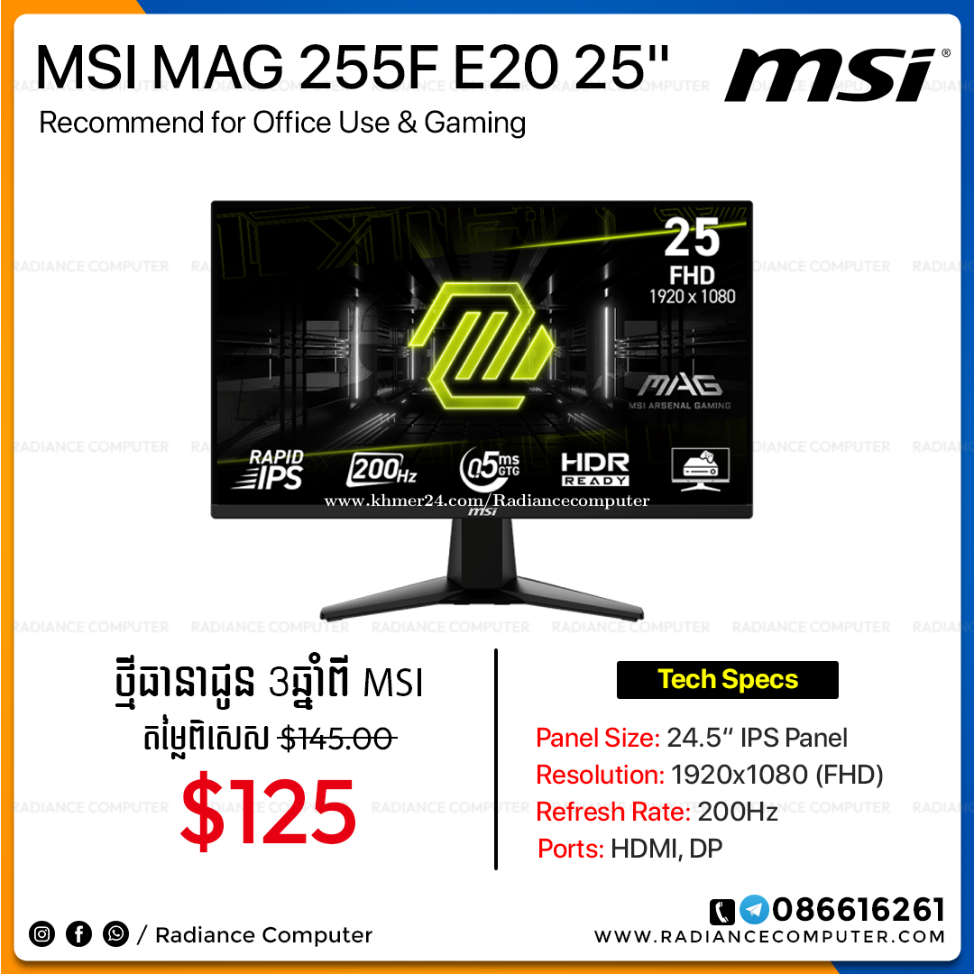 មានលក់នៅរេឌានកុំព្យូទ័រ រាល់ការជាវ Laptop និងទទួលបាន ការតម្លើង Software+ Game ឥតគិតថ្លៃ Lifetime ================== ☎️𝐂𝐚𝐥𝐥 𝐍𝐨𝐰: 086616xxxClick To Call- 011616xxxClick To Call 👉𝐖𝐨𝐤𝐢𝐧𝐠 𝐓𝐢𝐦𝐞: 8:00am - 6:30pm (Mon-Sun) 👉𝐓𝐢𝐤𝐓𝐨𝐤: https://www.tiktok.com/@radiancecomputer 🌐𝐖𝐞𝐛𝐬𝐢𝐭𝐞: https://www.radiancecomputer.com/#promotion 💬𝐓𝐞𝐥𝐞𝐠𝐫𝐚𝐦: 086616xxxClick To Call https://t.me/radiancecomputerkh 👉𝐓𝐞𝐥𝐞𝐠𝐫𝐚𝐦 𝐂𝐡𝐚𝐧𝐧𝐞𝐥: https://t.me/radiancesale 🗺ទីតាំង: ក្រោយវិទ្យាល័យជាស៊ីមសាមគ្គី 🗺Map : https://maps.app.goo.gl/aqncarjP8VPA7vLE9 ========================= #radiancecomputerkh #MSI #monitor