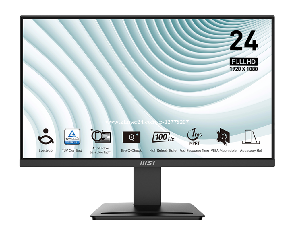 PANEL SIZE 23.8" PANEL RESOLUTION 1920 x 1080 (FHD) REFRESH RATE 100Hz RESPONSE TIME 1ms (MPRT) / 4ms (GTG) PANEL TYPE VA BRIGHTNESS (NITS) 300 cd/m2 VIEWING ANGLE 178°(H) / 178°(V) ASPECT RATIO 16:9 CONTRAST RATIO 4000:1 sRGB 113% (CIE 1976) ACTIVE DISPLAY AREA (MM) 527.04(H) x 296.46(V) PIXEL PITCH (H X V) 0.2745(H) x 0.2745(V) SURFACE TREATMENT Anti-glare DISPLAY COLORS 16.7M COLOR BIT 8 bits (6bits + FRC) VIDEO PORTS 1x HDMI™ (1.4b) 1x DP (1.2a) KENSINGTON LOCK Yes VESA MOUNTING 75 x 75 mm POWER TYPE External Adaptor (12V 2.5A) POWER INPUT 100~240V, 50~60Hz ADJUSTMENT (TILT) -5° ~ 20° DIMENSION (W X H X D) 541.9 x 182.0 x 428.5 mm (21.33 x 7.17 x 16.87 inch) CARTON DIMENSION (W X H X D) 605 x 116 x 407 mm (23.82 x 4.57 x 16.02 inch) WEIGHT (NW / GW) 2.9 kg (6.39 lbs) / 4.4 kg (9.7 lbs) CERTIFICATES CB/CE Energy Star VIDEO INPUT COMPATIBILITY PC, Mac, PS5™, PS4™, Xbox, Mobile, Notebook * All trademarks and the registered trademarks are the property of their respective owners. Note HDMI™: 1920 x 1080 (Up to 100Hz) DP: 1920 x 1080 (Up to 100Hz) Adaptive Sync Support