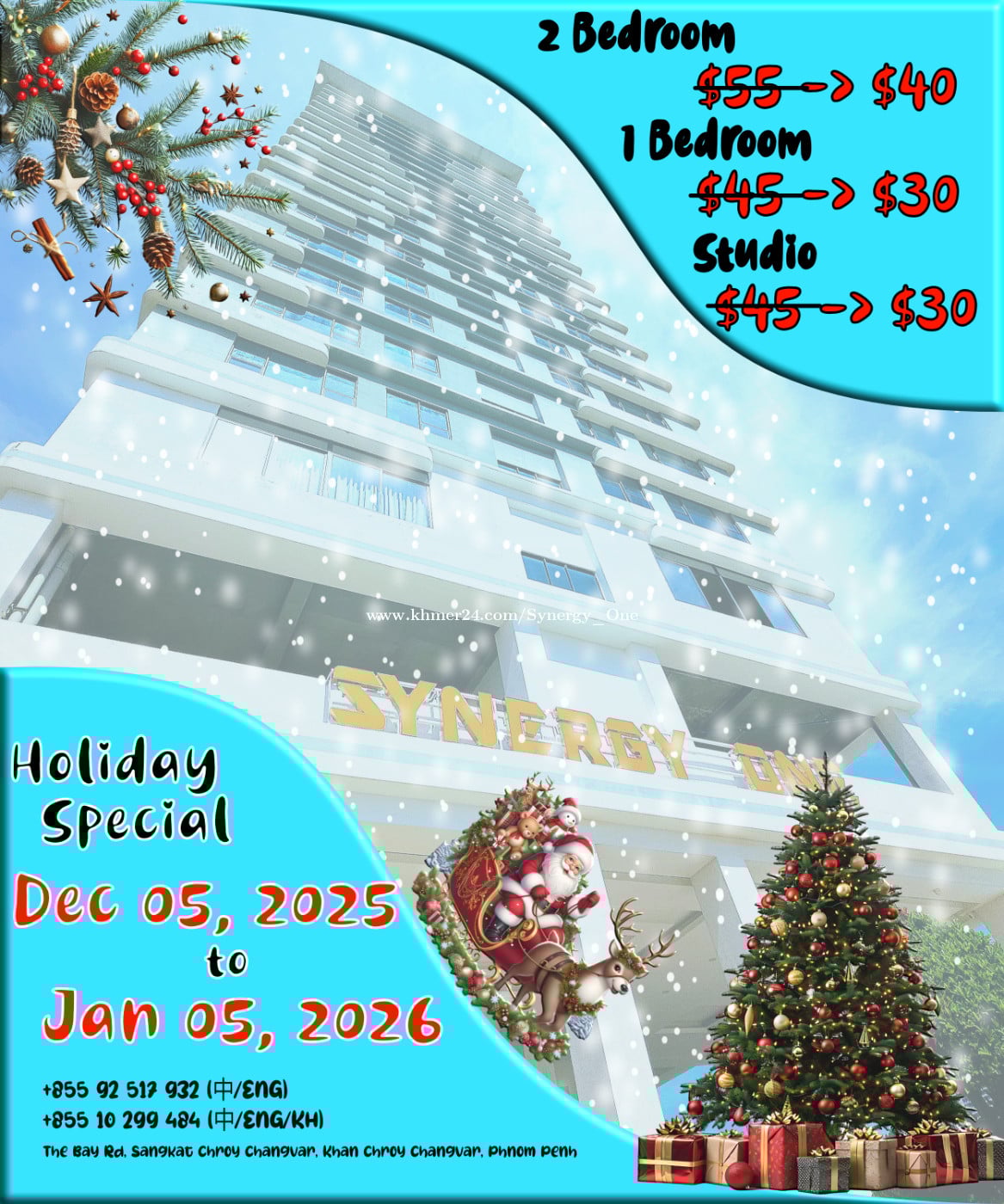 !!!!Special Offer!!!! ❗️ 05.12.2025 ដល់ 05.01.2026 ❗️ 2025年12月05日 至 2026年1月05日 ❗️ December 05, 2025 to January 05, 2026 [中文/English below] 🎉 ទទួលបានការបញ្ចុះតម្លៃពិសេសនាថ្ងៃឈប់សម្រាកខាងមុខនេះ សម្រាប់ភ្ញៀវដែលស្វែងរកខុនដូដើម្បី ស្នាក់នៅថ្ងៃ បុណ្យគ្រីស្ដស្មាស៍ និង មើលកាំជ្រួចថ្ងៃឆ្លងឆ្នាំខាងមុខនេះ 🎉 假日特惠,在尋找 過聖誕夜和跨年看煙火的地方? 來訂我們這兒 🎉 Holiday special offer, looking a place for Christmas night and watching firework on New Year Eve? Book a place at Synergy ONE now! ➡️ Studio unit from 💲4️⃣5️⃣ to 💲3️⃣0️⃣ ➡️ 1 Bedroom unit from 💲4️⃣5️⃣ to 💲3️⃣0️⃣ ➡️ 2 Bedroom unit from 💲5️⃣5️⃣ to 💲4️⃣0️⃣ ----------------------- 🏢 ខុនដូសម្រាប់ជួល 🟢 អាចជួលសម្រាប់ការស្នាក់នៅរយៈពេលវែង និងខ្លី ➡️ មានបន្ទប់ស្ទូឌីយូ, 1 បន្ទប់គេង និង 2 បន្ទប់គេង ✅ គ្រប់បន្ទប់ទាំងអស់មានរួមបញ្ចូល 👉 បំពាក់ WiFi, ទូរទស្សន៍ឆ្លាតវៃ, សេវាសម្អាត ១ដង/សប្ដាហ៍, សន្ដិសុខ 24/7 👉 អាងហែលទឹក, ក្លឹបហាត់ប្រាណ, សួនលើដំបូល និងចំណត់យាន្ដយន្ដ ❗️ សេវាកម្មមិនរួមបញ្ជូល 👉 ថ្លៃអគ្គិសនី 1000៛/ គីឡូវ៉ាត់ 👉 ថ្លៃទឹក 2000៛/ ម៉ែត្រគូប --------------------------------------------------------------------------------- 🏢 公寓出租 🟢 适合短期与长期住宿 ➡️ 套房,1房,2房 ✅ 每个房间又包括 👉 无线网络(WiFi),电视,每周一次清洁服务,24/7保全 👉 游泳池,健身房,露台,停车位 ❗️ 所有房间不包含 👉 电: $0.25/KW 👉 水:$0.5/M3 --------------------------------------------------------------------------------- 🏢 Apartment for rent 🟢 Available for short and long term stay ➡️ Studio, 1 Bedroom and 2 Bedroom ✅ All unit included 👉 Each room has WiFi access, smart TV, cleaning service once a week, security 24/7 👉 Swimming Pool, fitness center, terrace, parking space ❗️ Unit excluded utility 👉 Electricity: $0.25/KW, 👉 Water:$0.5/M3