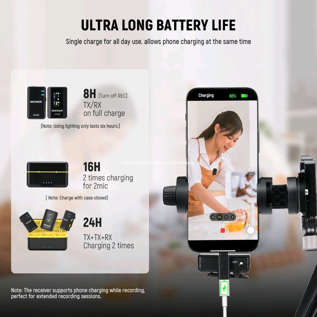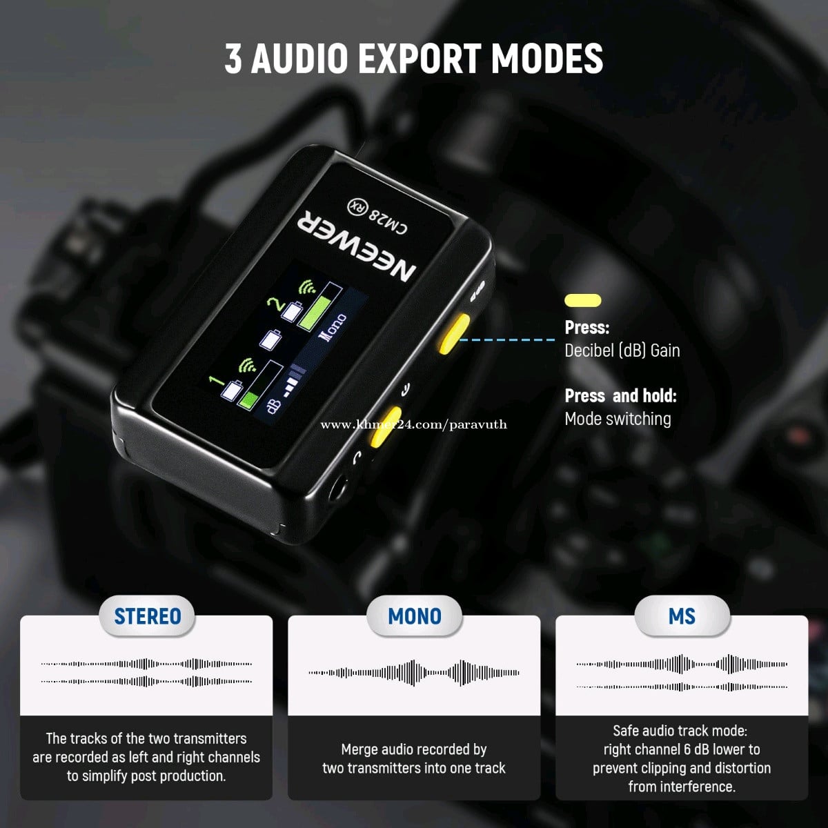 ๐ค Key Features: โ Dual wireless lavalier microphones โ 48kHz / 16-bit uncompressed audio โ 4GB standalone recording per transmitter (up to 9 hours) โ One-click noise cancellation & mute โ Up to 200m (656ft) wireless range (open area) โ Long battery life with charging case โ LCD screen with battery, volume & connection status โ Compatible with iPhone, Android, cameras, tablets & PC