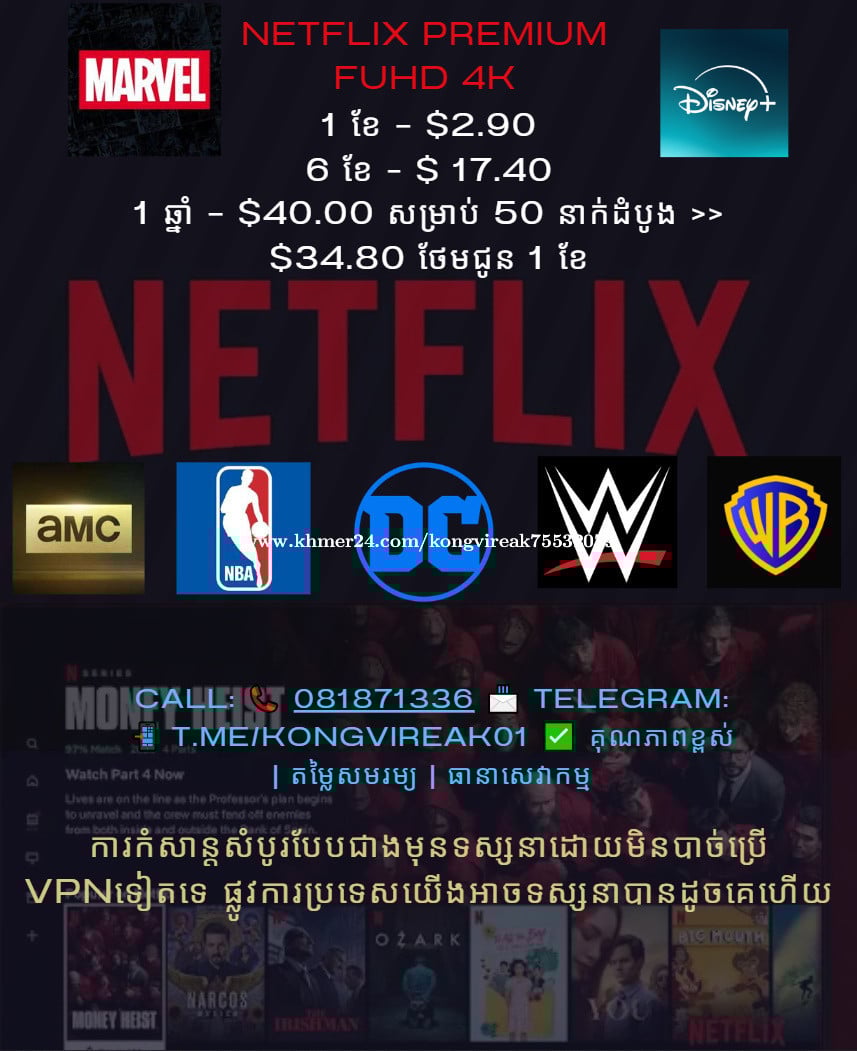 🟩 អ្វីដែលអ្នកទទួលបាន៖ ✅ Premium Account (4K Ultra HD Quality) ✅ 1 Screen Only – មានតែអ្នកទេសម្រាប់មើល ✅ Profile ផ្ទាល់ខ្លួន – ដាក់ឈ្មោះអ្នកផ្ទាល់ ✅ Private Profile + PIN Code 🔒 គ្មាននរណាអាចចូលប្រើបានក្រៅពីអ្នក 🛡 ធានាសេវាកម្ម 100% សងលុយវិញ បើ៖ ⚠️ Account មានបញ្ហា ⚠️ មើលមិនគ្រប់រយៈពេល 💰 សងប្រាក់ចំនួនខែដែលនៅសល់ 📩 ចាប់ផ្តើមឥឡូវនេះ! សូម Inbox ឬ Telegram ដើម្បីចុះឈ្មោះ ឬ សួរព័ត៌មានបន្ថែម។ 📞 Call: 📞 Smart081871xxxClick To Call 📨 Telegram: 📲 t.me/kongvireak01 ✅ គុណភាពខ្ពស់ | តម្លៃសមរម្យ | ធានាសេវាកម្ម
