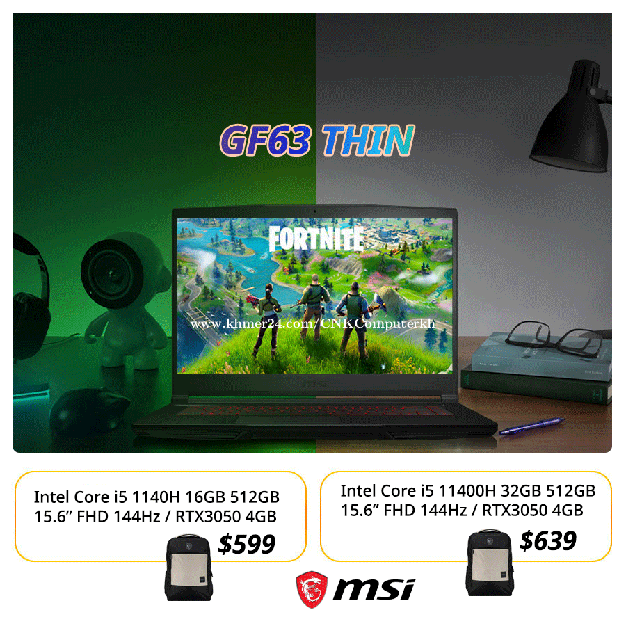 NEW, Gaming MSI GF63 11UC $599 ---------------------------------------- - Intel Core i5-11400H 6Cores/12Threads - RAM : 16GB (DDR4) = 32GB = $40 - Storage : 512GB M.2 PCIe - 15.6" FHD (1920x1080) IPS 144Hz - VGA 1 : Intel UHD Graphics - VGA 2 : NVIDIA RTX 3050 4GB - Windows 11 License | Backlit - Weight : 1.6Kg | Black ๐๐๐ ๐๐จ๐ฆ๐ฉ๐ฎ๐ญ๐๐ซ (แแแแผแแแแแแปแแถแแแแแ) โ๏ธ แแแถแแแแแแ 0930957xxxClick To Call 77 ๐ฌ Telegram : t.me/cnkcomputer93 ๐ Website: https://cnkcomputer.com/