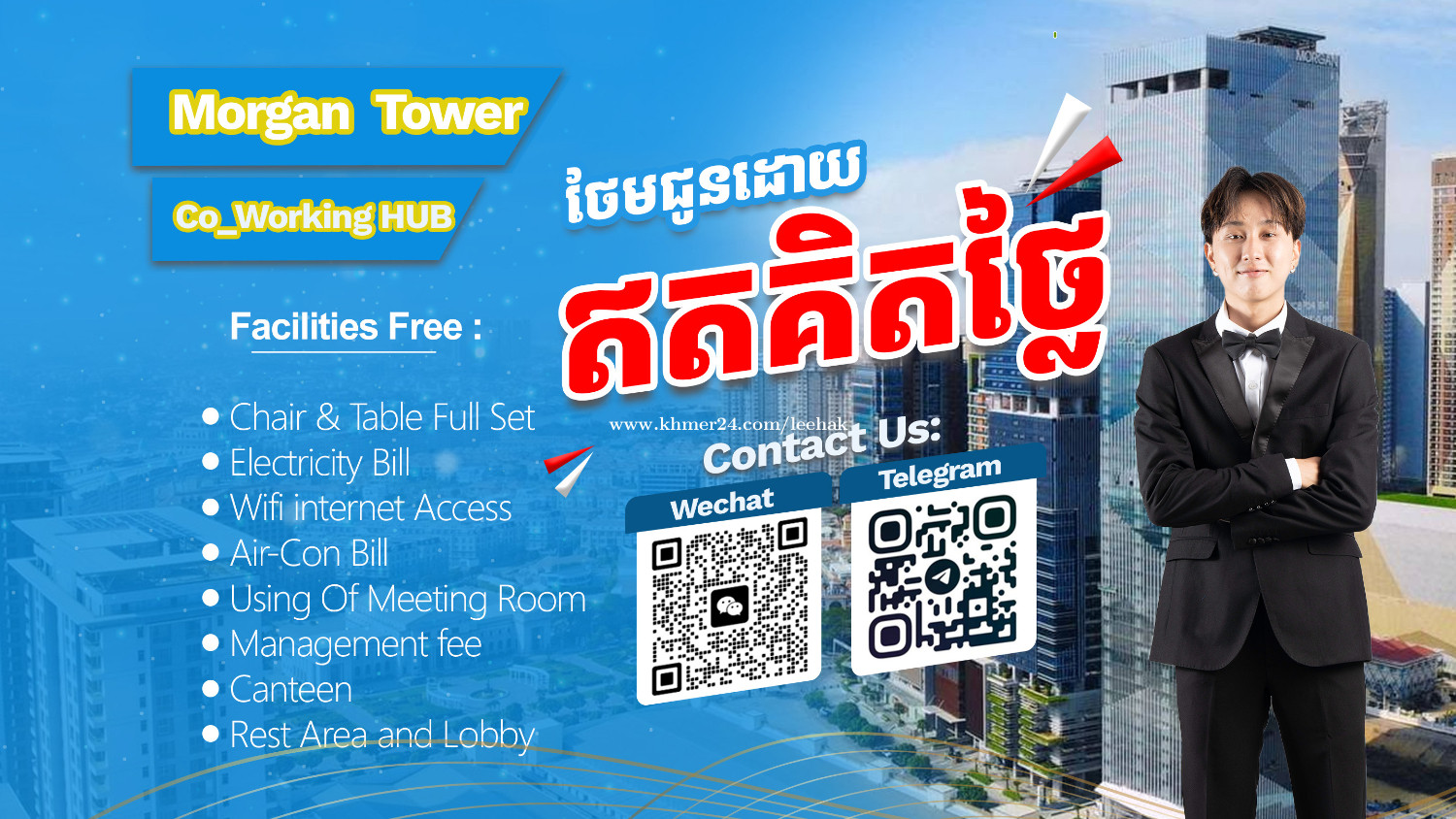 ๐ฃ Office Space for Rent at Morgan Tower โ Co-Working Space ๐ข Office Details Price Range: Only $199 to $1,373 per month Room Sizes: From 11 sqm to 54 sqm Perfect for startups, small teams, remote teams, or expanding businesses โจ Whatโs Included for FREE โ๏ธ Electricity โ๏ธ Water โ๏ธ Office table & chair โ๏ธ High-speed WiFi โ๏ธ Air conditioner โ๏ธ Meeting room access โ๏ธ Management fee โ๏ธ 1 elevator access card Everything you need to start working immediately โ no hidden costs! ๐ Contact Us For viewing or more details, please contact: ๐ฑ 0966216xxxClick To Call ๐ฑ 078254xxxClick To Call ๐ฉ Telegram: https://t.me/LCH_24
