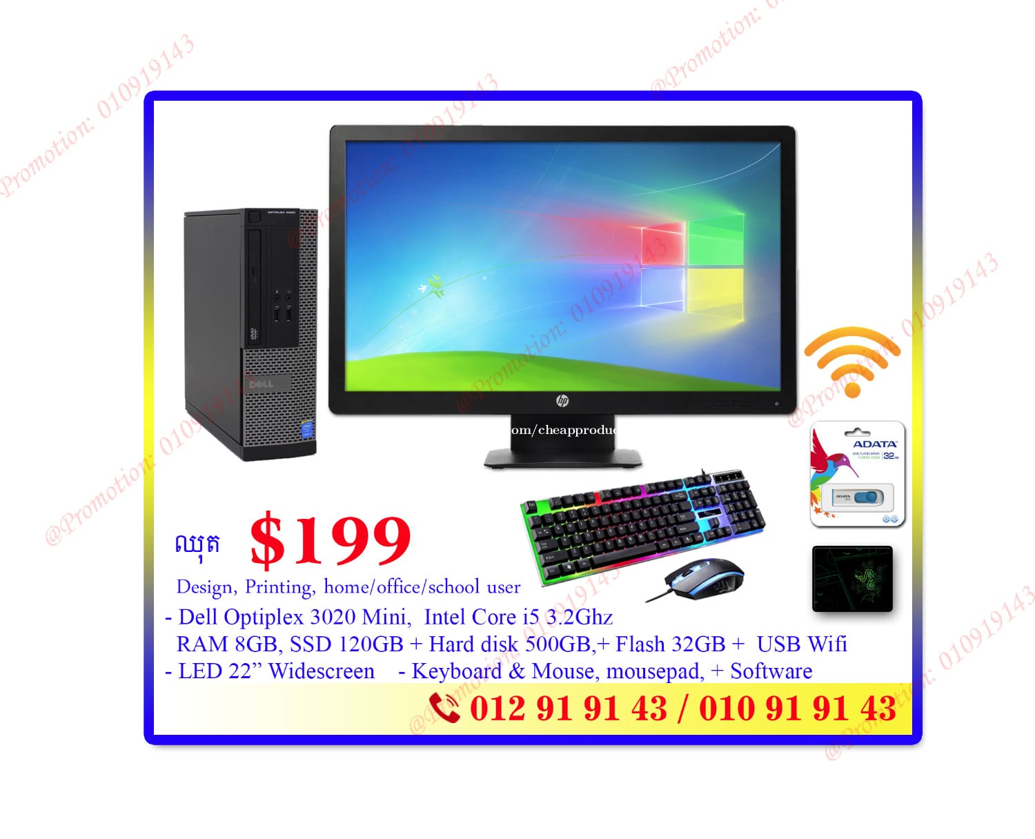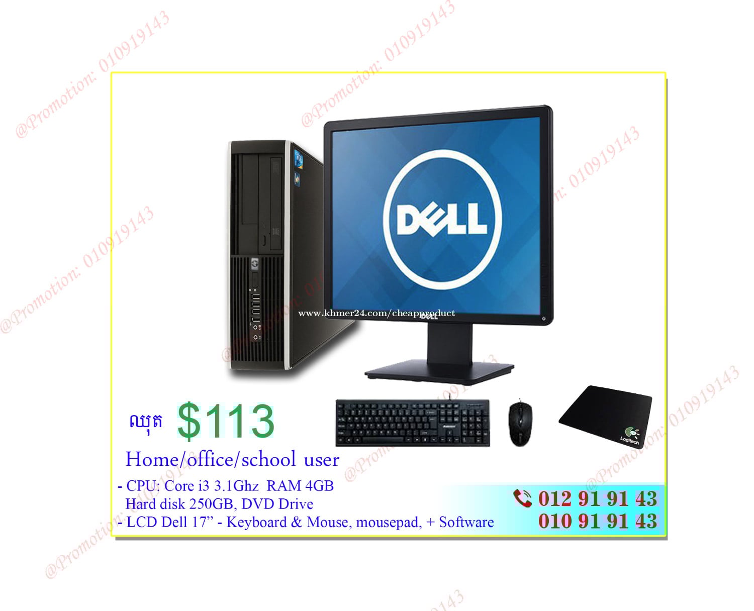 Promotion Set available in stock! ឈុត Computer i5 3.24Ghz / Ram 8GB/ HDD 500GB & SSD 120GB for Designer Office & home user 9=>(ឈុត Set 9) for Design, Printing, home/office/online/school user System Dell OptiPlex 3020 mini - CPU: - CPU: Intel Core i5 3.2Ghz (4th) (= Faster Core i7 3rd Gen) - RAM: 8GB - Hard Disk: 500GB + SSD 120GB **Display: LED Dell 23 Inch Widescreen Full HD **Free Keyboard, Mouse, Mousepad + Cable ** Free Flash 32GB + Free Design Software ** Free USB Wifi **Free window & software installation Good for Designer, Printing, Home/School, office, online use ***** Reference #: Set0195-09 = Normal price: $270 =>Promotion Price: $235 -------------------------------- ទំនិញមានក្នុងស្តុក ------------------------------------------------- H/P: 010919xxxClick To Call | 012919xxxClick To Call ------------------------------------------------- Working Hour: 8:00 am to 6:00 pm សំរាប់ការកម្មង់ទិញ ឬ ពត៍មានបន្ថែម សូម CALL ទាក់ទងលេខខាងលើ៖ Welcome! Retail and Dealers -We care on Quality | Trustworthy | Reasonable Price -We also offer wholesale, Retail and Repair (Hardware Software) all kinds of new & used 8=>(ឈុត Set 8) for Design, Printing, home/office/online/school user Dell Mini 3020 - CPU: Intel Core i5 3.2Ghz 4th - RAM: 8GB - HDD 500GB + SSD 120GB **Display: LED 22 inch Widescreen **Free Keyboard, Mouse, Mouse pad + Cable ** Free Flash 32GB + Free Design Software ** Free USB Wifi ** Good for Designer, Printing, Home/School, office, online use ***** Reference #: Set0195-08 ** Regular Price $230 => Promotion Price: $199 -------------------------------- 6=>(ឈុត Set 6) for Design, Printing, home/office/online/school user HP Mini 6300/8300 - CPU: Intel Core i7 3.4Ghz (3rd gen) - RAM: 8GB - SSD 256GB + Hard Disk: 500GB **Display: LED Dell 24 Widescreen Full HD **Free Keyboard, Mouse, Mouse pad + Cable ** Free Flash 32GB + Free Design Software ** Free USB Wifi ** Good for Designer, Printing, Home/School, office, online use ***** Reference #: Set0096-06 ** Regular Price $255 => Promotion Price: $225 -------------------------------- 1=>(ឈុត Set 1) for home/office/school user with special price Reference # S029-01 System HP Mini - CPU: Intel Core i3 3.1Ghz - RAM: 4GB - Hard Disk: 500GB - ODD: DVD-Drive **Display: LED Dell 17 Inch **Free Keyboard, Mouse, Mousepad + Cable **Free window & software installation = Normal price: $135 =>Promotion Price: $113 --------------------------------