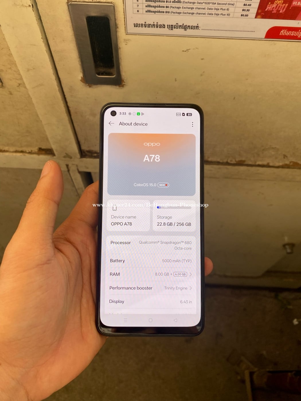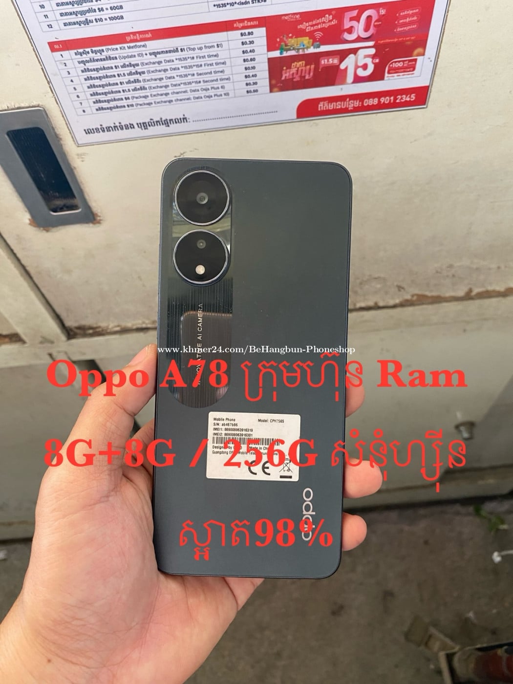 Oppo A78 ក្រុមហ៊ុន Ram 8G+8G / 256G សំនុំហ្សុីនស្អាត98% អេក្រង់AMOLED Refresh Rate 90hz ស្កេនក្រយៅដៃក្រោមអេក្រង់ ធានាម៉ាសុីនហ្សុីន អេក្រង់ហ្សុីន នឹងធានាការប្រេីប្រាស់រយៈពេល15ថ្ងៃ មានឆ្នាំងសាក មានសេវាដឹកជញ្ជូន25ខេត្ត-ក្រុង ទីតាំង : ជិតស្តុបលូប្រាំ ស្ទឹងមានជ័យ Tel : 099777xxxClick To Call / 081336xxxClick To Call / 0972312xxxClick To Call