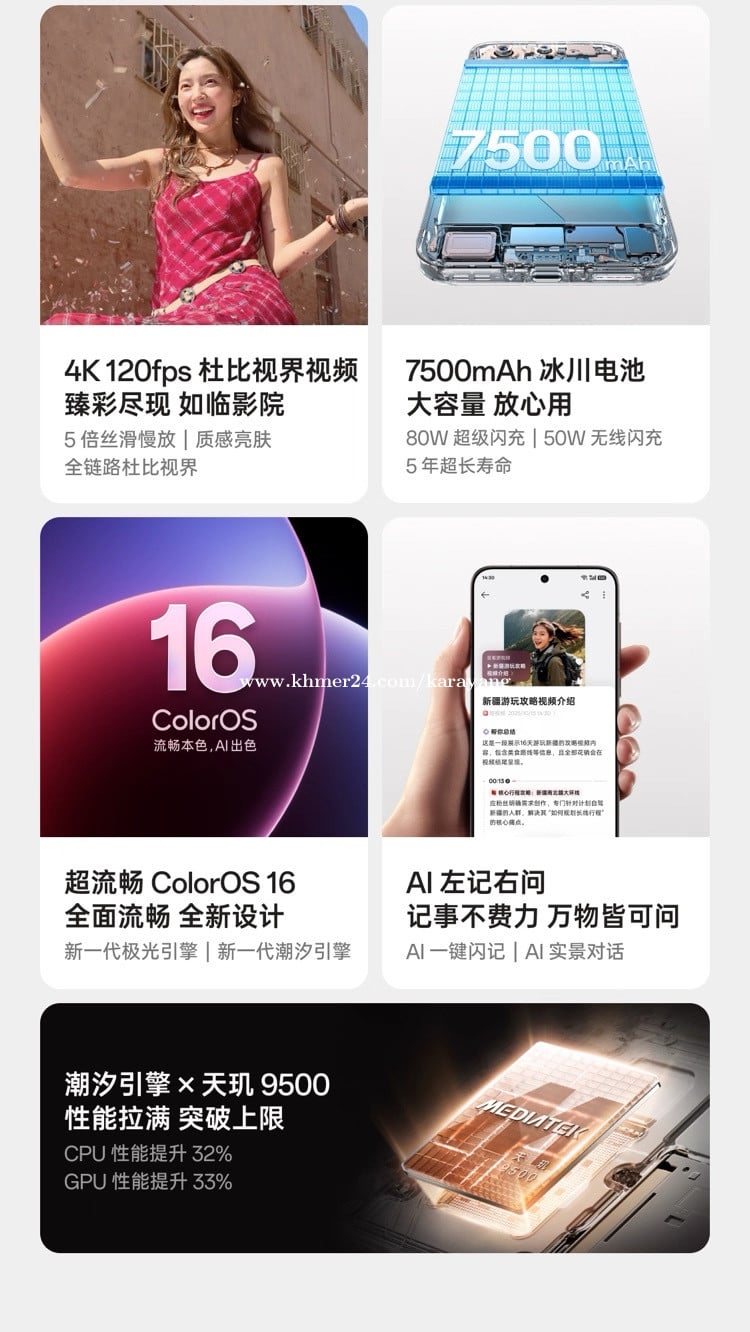 Accessories: Original full set. Stock: need to book then send from China, around 14-15 days delivery. Colors: 2 colors optional. Phone version: CN SIM2. Phone condition: 100% new boxed. CPU: Media Tek Dimensity 9500. Battery: 7500mAh. Wire charging peak power: 80W. Wireless charging peak power: 50W. Screen size: 6.78inch. Screen refresh rate: 120Hz. Main screen material: OLED. Screen type: full screen. Unlock: 3D Ultrasonic fingerprint. On market: October, 2025. Rear cameras: 200MP+50MP+50MP+2MP. Front camera: 50MP. System: ColorOS 16. Waterproof: IP66/IP68/IP69. PhonoX Smart Tech. Smarter Price. New | Used | Accessories | Trade-In 📍 Phnom Penh 📞 +85586587xxxClick To Call https://t.me/+qJxqHs0n5BdlZDE1 https://www.tiktok.com/@kara.yang39?_t=ZS-8xr7fEJ8ArQ&_r=1 Address: Phnom Penh, Dangkao District, Krang Pongro, Krang Svay.