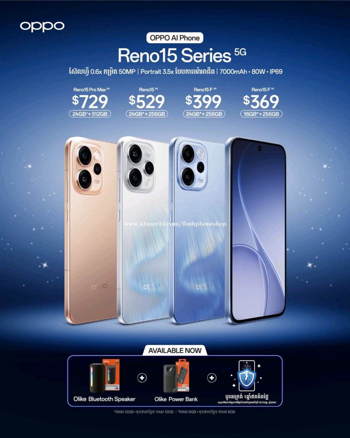 មានលក់ហើយ!! ទូរស័ព្ទ AI ជំនាន់ថ្មី OPPO Reno15 Series 5G ឥឡូវនេះមានដាក់លក់ជាផ្លូវការហើយ ជាមួយតម្លៃ៖ ✨$369 សម្រាប់ Reno15 F 5G (16GB*+256GB) ✨$399 សម្រាប់ Reno15 F 5G (24GB*+256GB) ✨$529 សម្រាប់ Reno15 5G (24GB*+256GB) ✨$729 សម្រាប់ Reno15 Pro Max 5G (24GB*+512GB) 🎁 កាន់តែអស្ចារ្យ! រាល់ការជាវឥឡូវនេះ អ្នកនឹងទទួលបានកាដូបន្ថែមភ្លាមៗរួមមាន៖ 🛍 Olike Bluetooth Speaker 🛍 Olike Power Bank 🛍 ប្តូរអេក្រង់ 1ឆ្នាំ ឥតគិតថ្លៃ (សម្រាប់ការទិញចាប់ពីថ្ងៃបើកលក់ដំបូងរហូតដល់ 28 កុម្ភៈ 2026) #OPPOReno15Series5G #ស្ទីលរចនាបែបពន្លឺវេទមន្ត