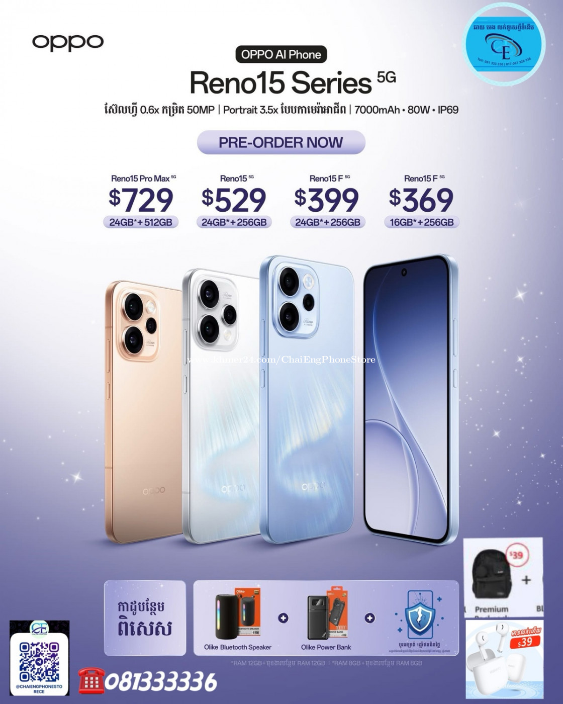 សំរាប់តម្លៃពិសេសសូមឆាត ឬ មកកាន់ហាងផ្ទាល់(ធានាតម្លៃពិសេសជូន✅) 👉 OPPO Reno15F(5G) Ram8G+GG/256GB តម្លៃ 3xx$ 👉 OPPO Reno15F(5G) Ram12G+12G/256GB តម្លៃ 3xx$ 👉 OPPO Reno15(5G) Ram12G+12G/256GB តម្លៃ 4xx$ 👉 OPPO Reno15 Pro Max(5G) Ram12G+12G/512GB តម្លៃ 6xx$ 👉 ទិញក៏បាន | បង់រំលស់ក៏បាន | ប្រើVISA Cardក៏បាន 👉 មានសេវាកម្មដឹកជញ្ជូនដល់កន្លែងនិងផ្ញើរជូន25ខេត្តក្រុង សំរាប់ពត័មានបន្ថែមសូមទាក់ទងមកកាន់លេខទូរសព្ទ័ ☎️ 081 333336, 076 2333336, 017 226338, 067 226338 👉 Telegram Shop:☎️ 081333xxxClick To Call https://t.me/CE_PhoneShop តម្លៃពិសេសល្អមាននៅទីនេះ 🗳 សូមចុចលីង Channel Telegram : https://t.me/ChaiEngPhoneStoreCE ✅ Group Telegram: https://t.me/joinchat/LVrUvnFniQpkODBl 📍https://goo.gl/maps/KjDyGuoDN4dMjiah9 📍អាស័យដ្ឋាន ផ្ទះលេខ68BE0 ផ្លូវ215 នេរុហ៍ សង្កាត់វាលវង់ ខណ្ឌ័7មករា រាជធានីភ្នំពេញ។ នៅខាងជើងផ្សារដេប៉ូប្រហែល 500ម៉ែត្រ #ChaiEngPhoneShop #CE #ChaiEngPhoneStore2 #OPPOReno15Series5G