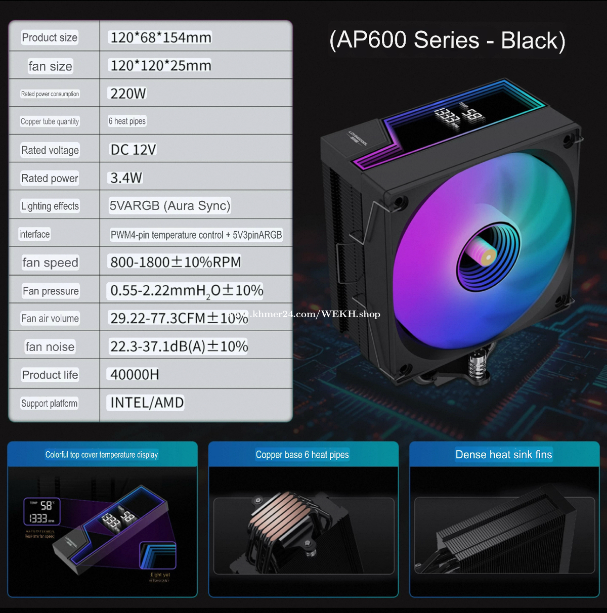 Product size: 120*68*154mm fan size:120*120*25mm Rated power consumption: 220W Copper tube quantity: 6 heat pipes Rated voltage: DC 12V Rated power: 3.4W Lighting effects: 5VARGB (Aura Sync) interface: PWM4-pin temperature control + 5V3pinARGB Support platform: INTEL/AMD ------------------------------------------------------------------------------------------- # RAM =>Desktop – - ADATA DDR3 8GB: $15 (New) - ADATA DDR4 8GB: $18 (New) - Samsung DDR4 18GB: $30 (New) # RAM =>Laptop – - ADATA DDR3 8GB: $15 (New) - ADATA DDR4 8GB: $18 (New) # New SSD HY - SSD 128GB: $15 (New) - SSD 256GB: $25 (New) -SSD 512GB: $35 (New) # New M2 - SK 128GB: $20 (New) - SK 256GB: $30 (New) -SSD 512GB: $45 (New) # Motherboard => Desktop – - Gigabyte H61: $30 (support Intel gen 2&3) - Asus H85: $35 (support Intel gen 4) - Gigabyte H110m: $40 (support Intel gen 6&7) - MSI H310m: $40 (support Intel gen 8&9) - MSI B560m: $50 (support Intel gen 10&11) ទំនិញមានក្នុងស្តុក - ដើម្បីទទួលបាន ព័ត៌មានថ្មីៗ លម្អិត និងការផ្តល់ជូនតម្លៃពិសេសៗ សូមទំនាក់ទំនង៖ Contact: 0969854xxxClick To Call / 0883332xxxClick To Call Telegram: https://t.me/yukmongkol