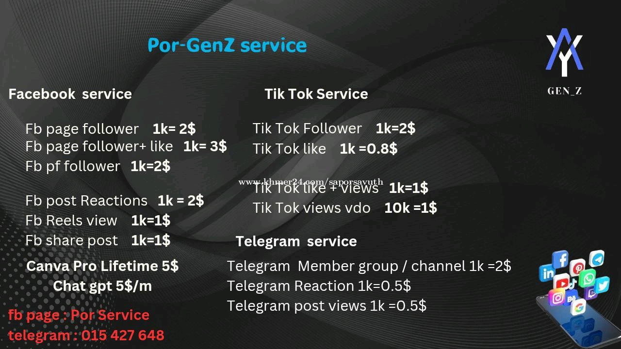 មានទទួលចាក់ like follow នៅលើ Facebook TikTok Instagram និងចាក់ members Telegram group /channel ជាពិសេសមាន លក់ Primer/ Pro នៅលើ app មួយចំនួនដូចជា Chat gpt , Canva pro ជាដើម ទំនាក់ទងទិញតាម Dm : @Por_GenZ (015427xxxClick To Call) ហើយ services Freelance work បើកទទួលធម្មតា🤭❤ - graphic design ( video editor &poster...) - digital marketing ... - Web design ( UX/UI) @Por_GenZ