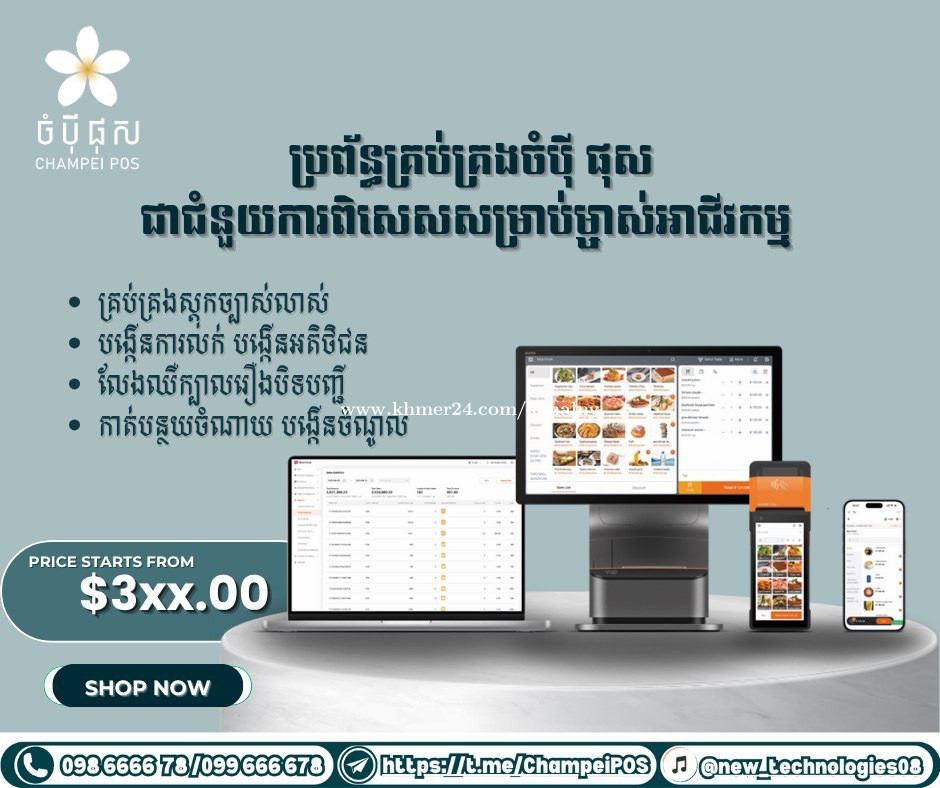 ប្រព័ន្ធគ្រប់គ្រងអាជីវកម្ម ចំបុី ផុស គឺជាជម្រើសដ៏ល្អបំផុតសម្រាប់អ្នកចង់ចាប់ផ្ដើមអាជីវកម្មមានប្រព័ន្ធគ្រប់គ្រងអាជីវកម្មចំប៉ី ផុស អ្នកនឹងទទួលបានអត្ថប្រយោជន៍ជាច្រើន៖ ✅ ទទួលបានការប្រើប្រាស់ម៉ាស៊ីន សមស្របទៅតាមប្រភេទអាជីវកម្ម ✅ ផ្តល់ការប្រើប្រាស់ពេញ ១ឆ្នាំដោយឥតគិតថ្លៃ ✅ ជួយសន្សំសំចៃ ក្នុងការចំណាយ ✅ បង្កើនអតិថិជនជូនលោកអ្នក ✅ គ្រប់គ្រងចំណូល-ចំណាយច្បាស់លាស់ ✅ ពិនិត្យរបាយការណ៍បានភ្លាមៗ ចំប៉ី ផុសមានមុខងារដ៏សម្បូរបែប និងទំនើបសម្រាប់ម្ចាស់អាជីវកម្មគ្រប់ប្រភេទ ។ ទំនាក់ទំនងមកកាន់យើងខ្ញុំឥឡូវនេះ ដើម្បីទទួលបានព័ត៌មានលម្អិត៖ ☎ 087601xxxClick To Call Telegram: https://t.me/champeipos2025 YouTube: https://www.youtube.com/channel/UCB_NnPwX5MrdiCusWrnsX1Q Tiktok: https://www.tiktok.com/@new_technologies08?_t=ZS-8ubq4gzD23U&_r=1