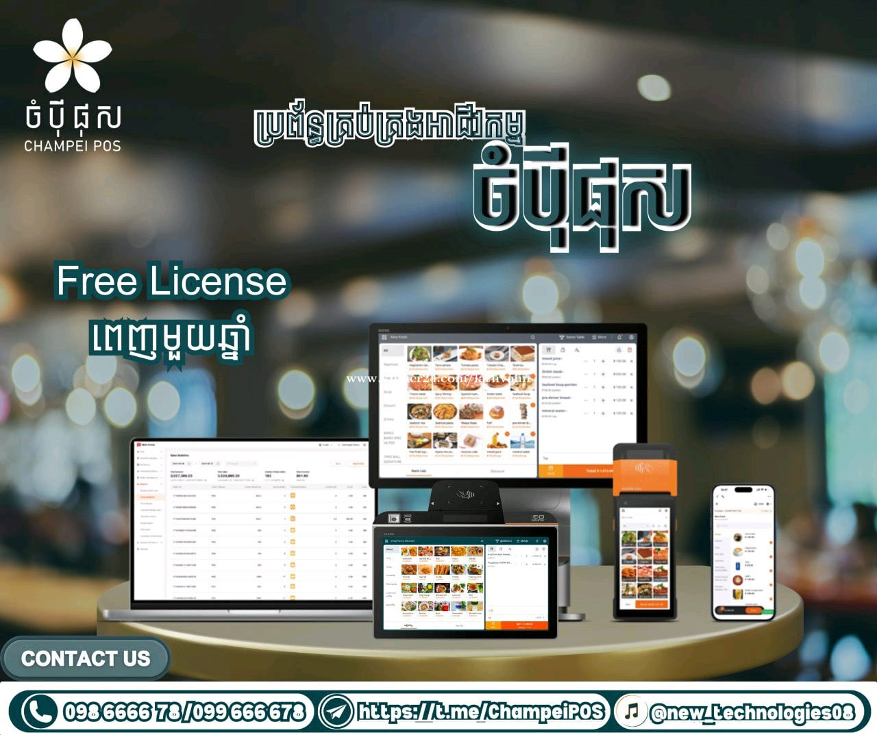 កាន់តែមានភាពងាយស្រួលសម្រាប់ម្ចាស់អាជីវកម្មគ្រប់ប្រភេទ ជាមួយប្រព័ន្ធគ្រប់គ្រងអាជីវកម្ម ចំបុី ផុស រួមទាំងអត្ថប្រយោជន៍ជាច្រើនដូចជាៈ -ចំណេញពេលវេលា -គ្រប់គ្រងស្តុកបានច្បាស់លាស់ -ពិនិត្យរបាយការណ៍បានភ្លាមៗ -បញ្ជាទិញតាម QR code បានដោយខ្លួនឯង -គ្រប់គ្រងតុដែលនៅមាន និងតុដែលកក់រួច -ការធ្វើប្រូម៉ូសិន សម្រាប់អតិថិជន រួមជាមួយមុខងារដ៍សំបូរបែបជាច្រើនទៀត ដើម្បីជួយបង្កើនការលក់ ចាប់ផ្ដើមអាជីវកម្ម ចាប់ផ្ដើមជាមួយចំប៉ី ផុស! ☎️ ទំនាក់ទំនងផ្នែកលក់៖ 093300xxxClick To Call/098666xxxClick To Call Telegram: https://t.me/ChampeiPOS