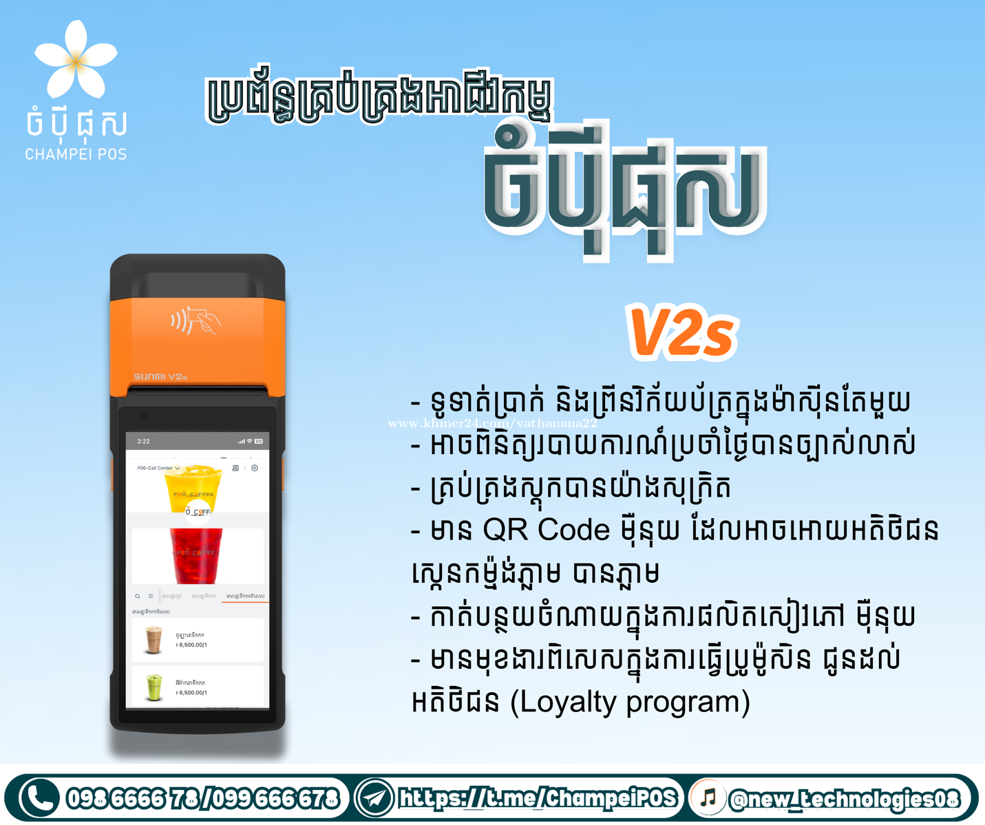 ម៉ាសុីន V2s អាចជួយកាត់បន្ថយចំណាយរបស់អាជីវករបានដូចជា ៖ - ទូទាត់ប្រាក់ និងព្រីនវិក្កយបត្រក្នុងម៉ាស៊ីនតែមួយ - អាចពិនិត្យរបាយការណ៍ប្រចាំថ្ងៃបានច្បាស់លាស់ - គ្រប់គ្រងស្តុកបានយ៉ាងសុក្រិត - មាន QR Code ម៉ឺនុយ ដែលអាចអោយអតិថិជនស្កេនកម៉្មង់ភ្លាម បានភ្លាម - កាត់បន្ថយចំណាយក្នុងការផលិតសៀវភៅ ម៉ឺនុយ - មានមុខងារពិសេសក្នុងការធ្វើប្រូម៉ូសិន ជូនដល់អតិថិជន (Loyalty program) ___________________________________________ ចង់ដឹងព័ត៌មានលម្អិត សូមទំនាក់ទំនងឬចុចលើលីងខាងក្រោមនេះ ☎️ 098666xxxClick To Call / 099666xxxClick To Call / 0716666xxxClick To Call 🔗 Telegram : https://t.me/champeipos2025 🔗 Tik Tok : https://www.tiktok.com/@new_technologies08?_t=ZS-8ubq4gzD23U&_r=1 🔗 Youtube : https://www.youtube.com/channel/UCB_NnPwX5MrdiCusWrnsX1Q