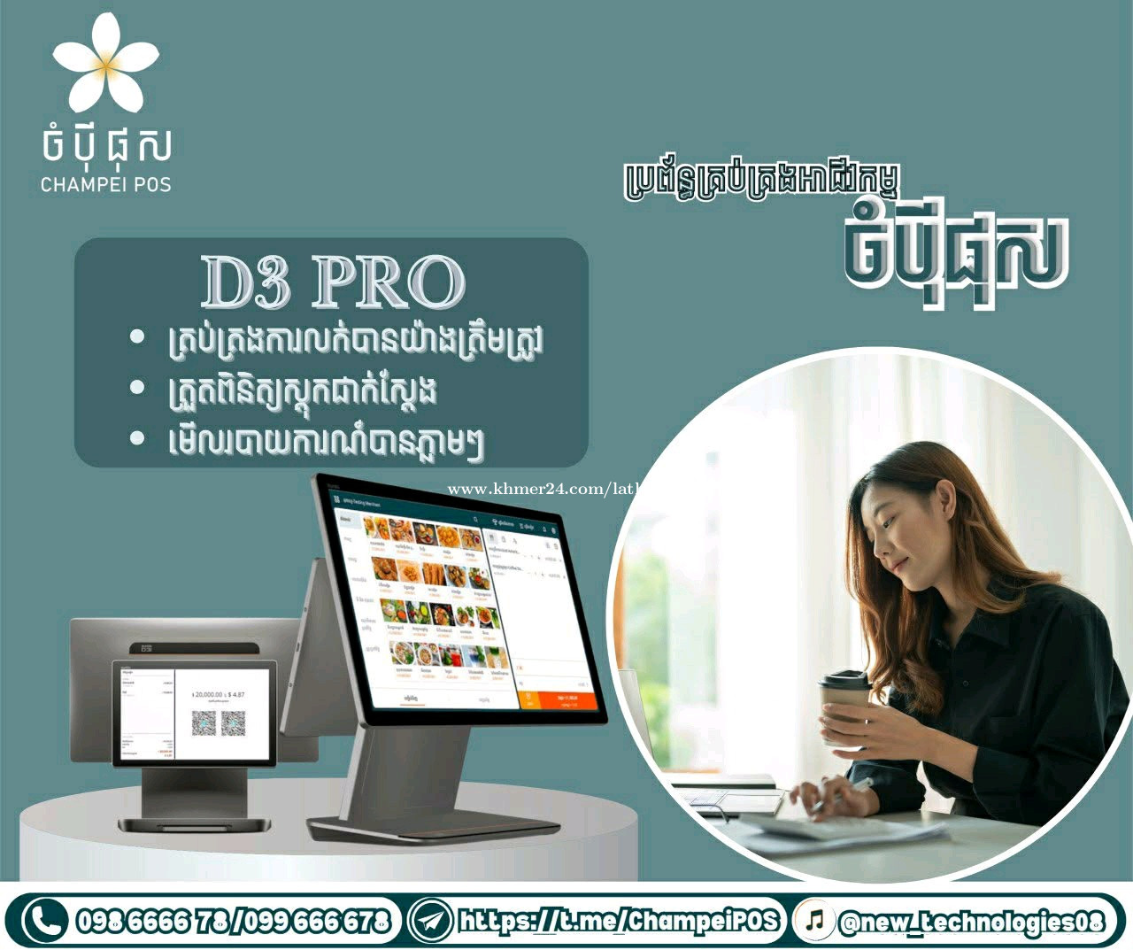 កាន់តែមានភាពងាយស្រួលសម្រាប់ម្ចាស់អាជីវកម្មគ្រប់ប្រភេទ ជាមួយប្រព័ន្ធគ្រប់គ្រងអាជីវកម្ម ចំបុី ផុស រួមទាំងអត្ថប្រយោជន៍ជាច្រើនដូចជាៈ -ចំណេញពេលវេលា -គ្រប់គ្រងស្តុកបានច្បាស់លាស់ -ពិនិត្យរបាយការណ៍បានភ្លាមៗ -បញ្ជាទិញតាម QR code បានដោយខ្លួនឯង -គ្រប់គ្រងតុដែលនៅមាន និងតុដែលកក់រួច -ការធ្វើប្រូម៉ូសិន សម្រាប់អតិថិជន រួមជាមួយមុខងារដ៍សំបូរបែបជាច្រើនទៀត ដើម្បីជួយបង្កើនការលក់ ចាប់ផ្ដើមអាជីវកម្ម ចាប់ផ្ដើមជាមួយចំប៉ី ផុស! ☎️ ទំនាក់ទំនងផ្នែកលក់៖ 093300xxxClick To Call/098666xxxClick To Call Telegram: https://t.me/ChampeiPOS