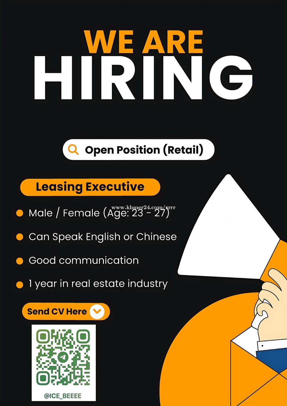 Position: Leasing executive (Retail) Candidate: Male / Female Age: 23-27 years old Experience: Real Estate 1year up Required: Friendly & Good Communication Language: Chinese / English Located: Sangkat Rolus, Khan Dangkao, Phnom Penh Telegram: 099979xxxClick To Call