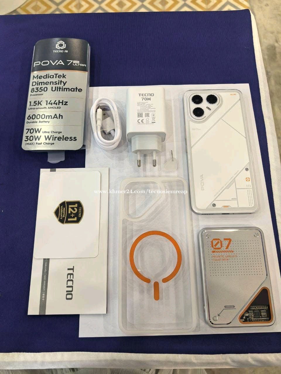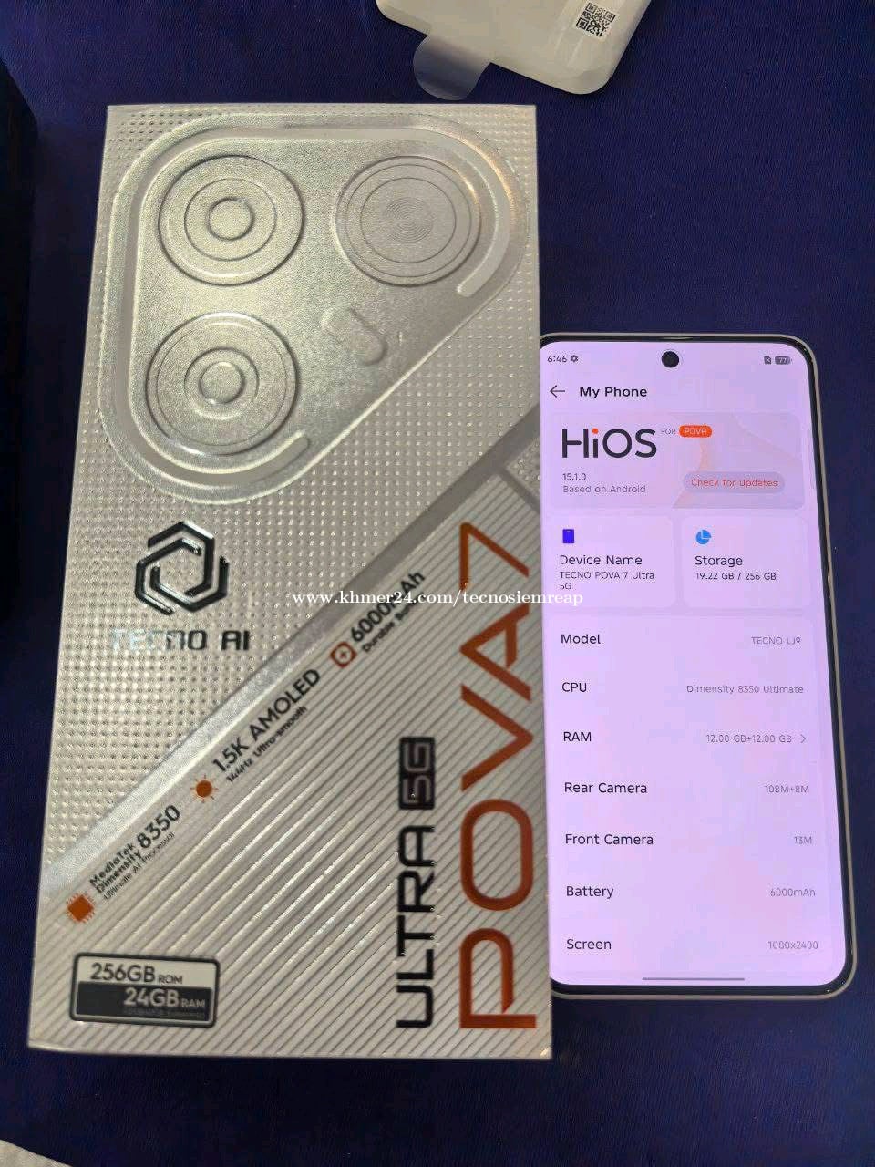 Pova 7 Ultra 5G 329$ Ram8+8GB Rom256GB 359$ Ram12+12GB Rom256GB ✨អេក្រង់6.67" 144Hz ✨ថ្ម 6000mAh សាកលឿន70W ✨សាក Wireless support 30W ✨Chip Dimensity 8350 Ultimate ✨ Android Version 15 ✨ប្រព័ន្ធការពារទឹក IP64 ✨កាមេរ៉ាក្រោយ 108MP+8MP ✨កាមេរ៉ាមុខ 13MP ✨ភ្លើង LED ជុំវិញកាមេរ៉ា ✨ស្កេនក្រយ៉ៅដៃលើអេក្រង់ 📍ទីតាំង ស្ថិតនៅលើផ្លូវលោកតាណឺយ សង្កាត់ស្លក្រាម ក្រុងសៀមរាប (ទល់មុខពេទ្យធ្មេញកម្ពុជា) 🚛Freeដឹកជញ្ជូន25ខេត្តក្រុង ☎️Tel: 0964906667/ 017906667 #Tecno #Pova7Ultra5G #pova7ultra5g