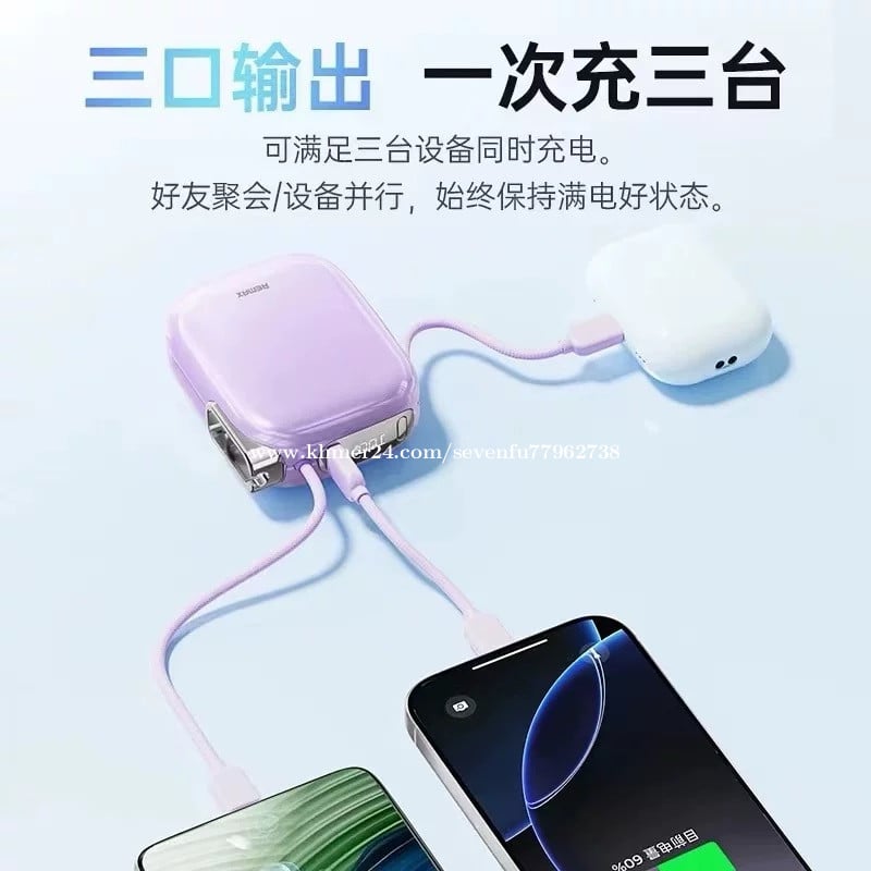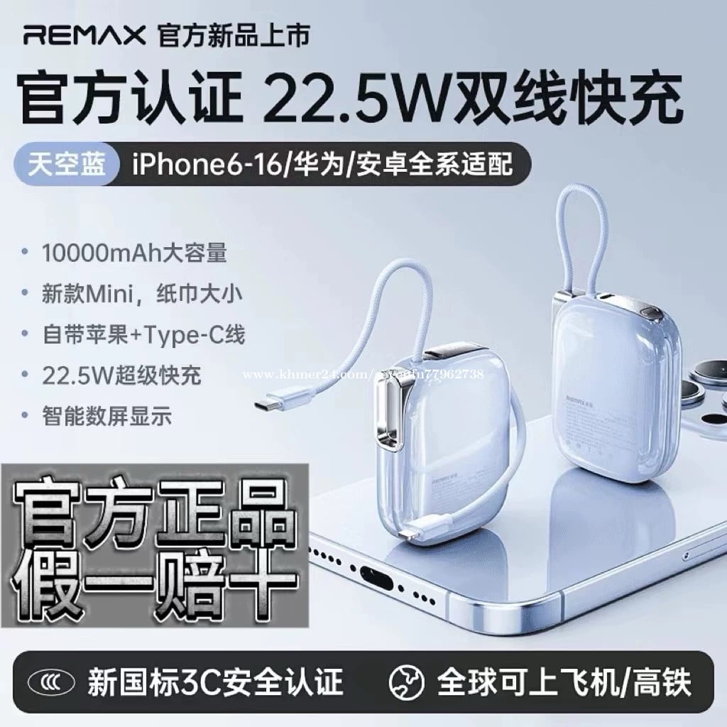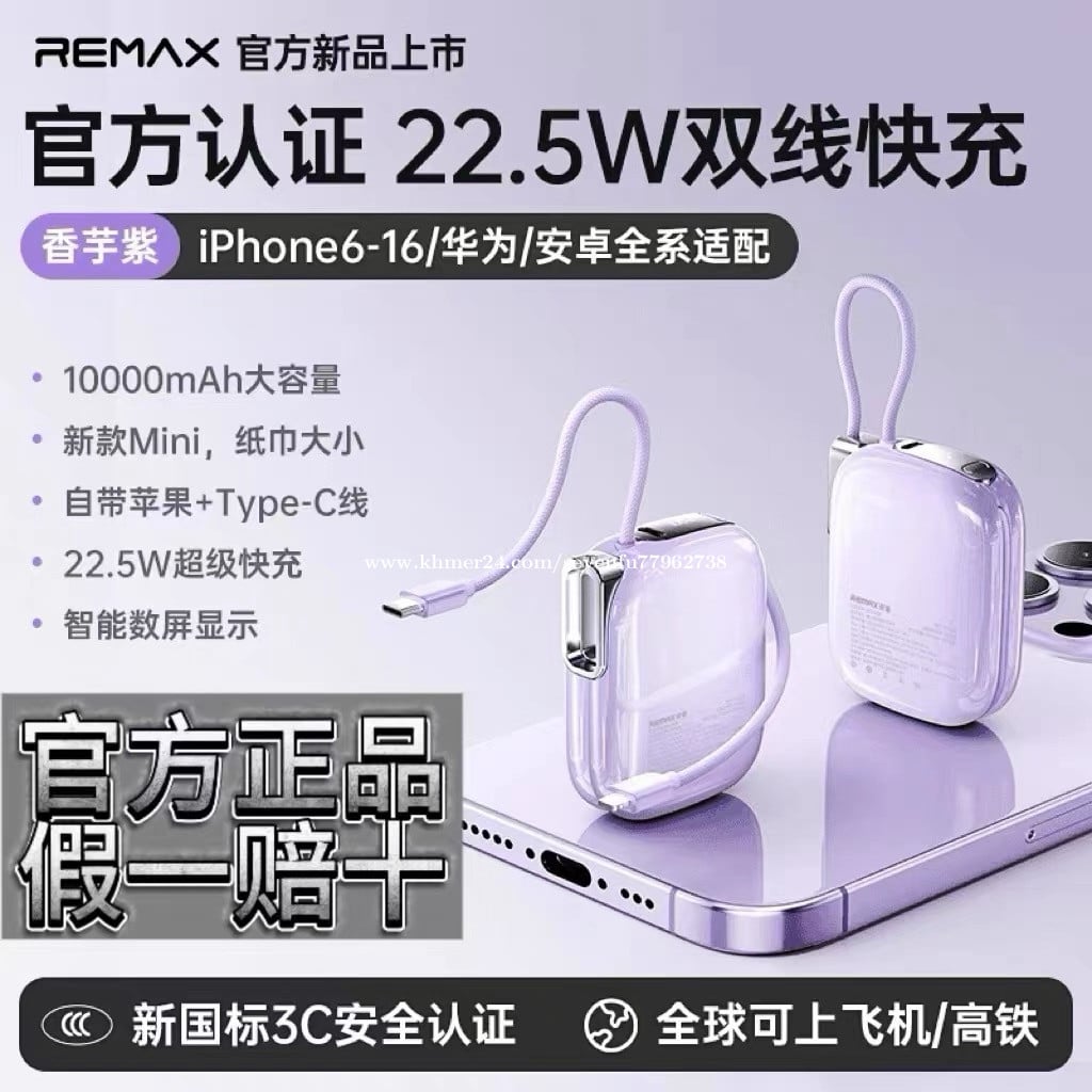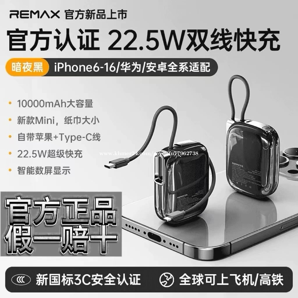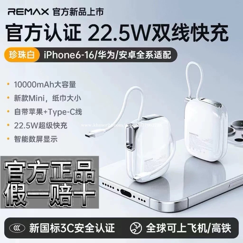 🔋 សមត្ថភាព 10,000mAh – អាចសាកទូរស័ព្ទបានប្រហែល 2–3 ដង • ⚡ សាកលឿន Super Fast Charge – អតិបរមា 22.5W (Type-C) / 20W (Lightning) សាកបានលឿន • 🔌 មានខ្សែភ្ជាប់ក្នុងខ្លួន – មាន Type-C និង Lightning (Apple) មិនចាំបាច់យកខ្សែបន្ថែម • 🔄 សាកបានពីរឧបករណ៍ពេលតែមួយ – ងាយស្រួលប្រើ • 🧳 ទំហំតូច ស្រាល ងាយយកតាមខ្លួន – សមស្របសម្រាប់ធ្វើដំណើរ • ✈️ អាចយកឡើងយន្តហោះបាន – សុវត្ថិភាព • 🛡️ មានវិញ្ញាបនបត្រ 3C – ការពារកម្ដៅ លើសភ្លើង និងសុវត្ថិភាពខ្ពស់ • 🎨 រចនាស្អាត មានពណ៌ជ្រើសរើសច្រើន ផលិតដោយក្រុមហ៊ុន REMAX ដែលល្បីខាងគ្រឿងបន្លាស់ទូរស័ព្ទ។