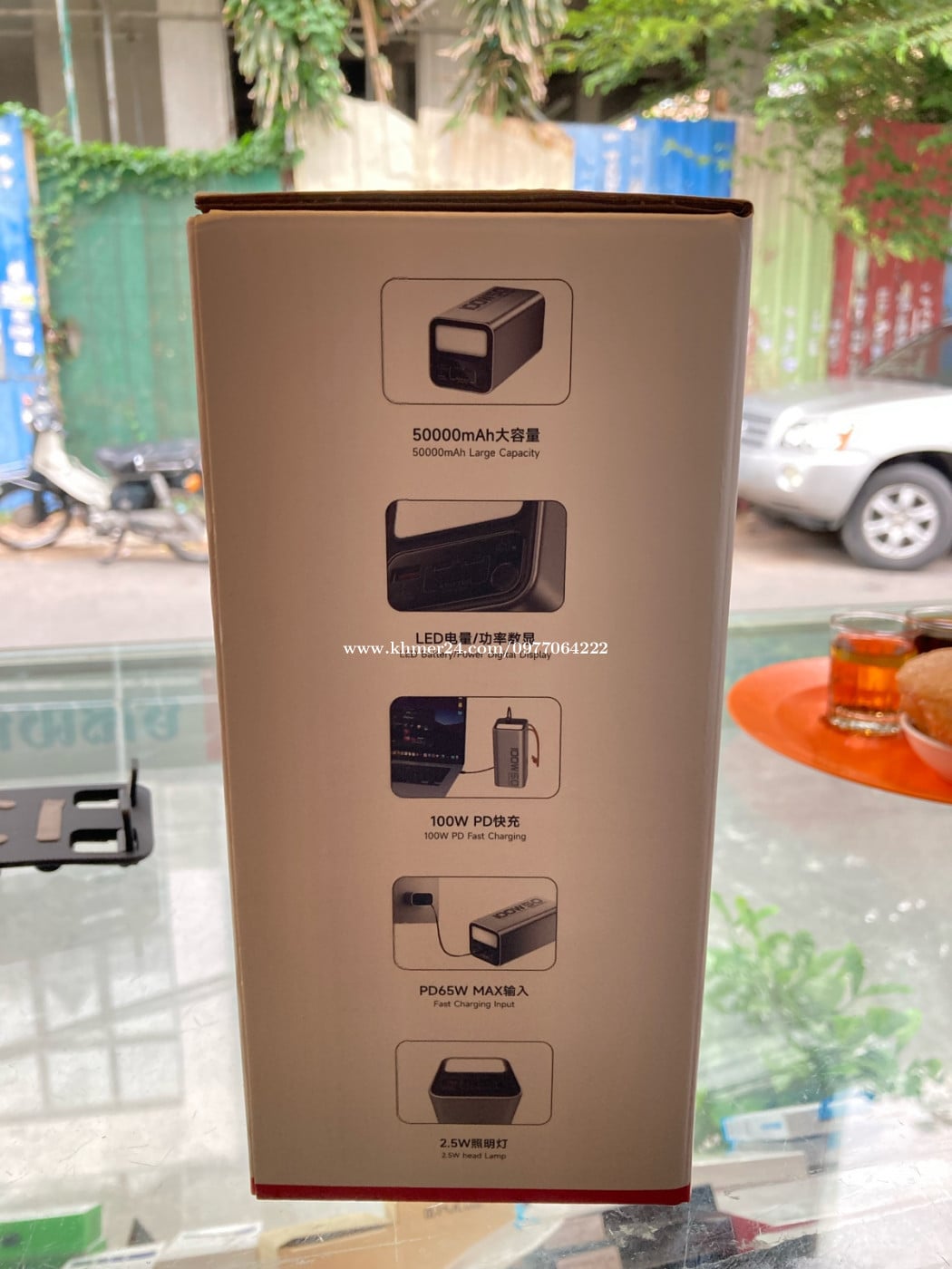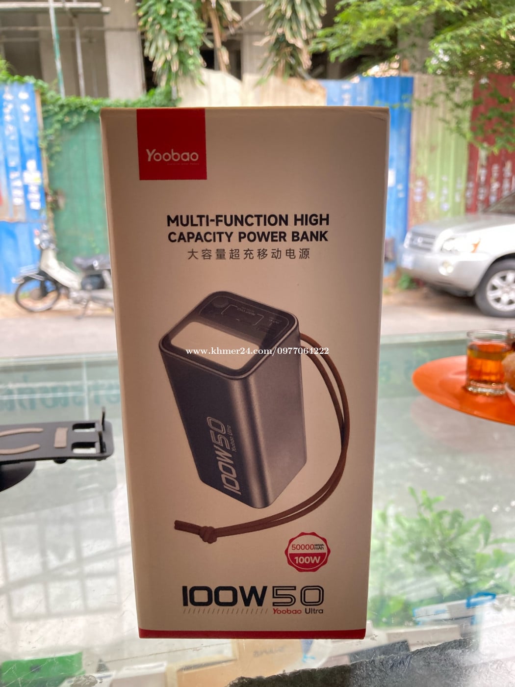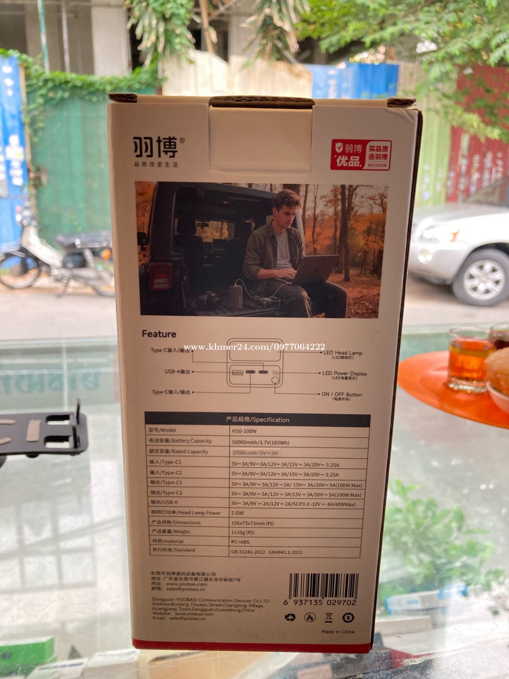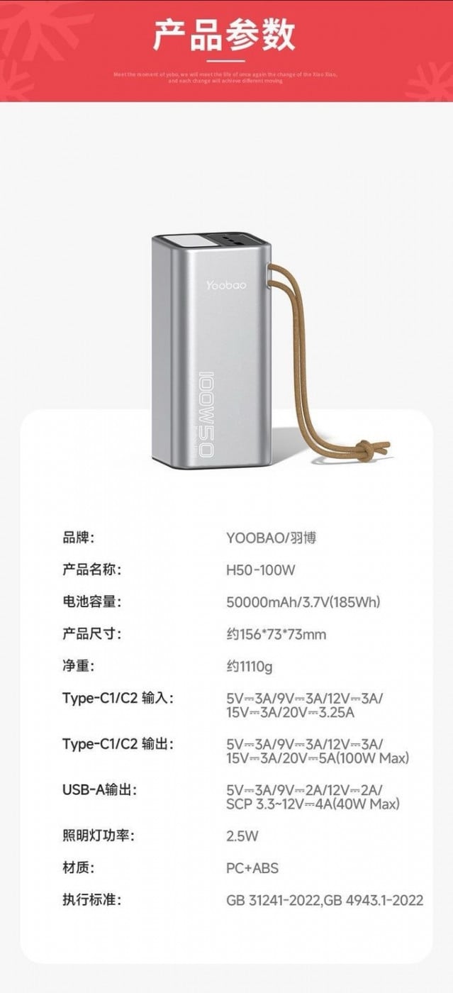 PowerBank 50000mAh 100w មានពិល ប្រើបានជាមួយទាំង Laptop Tablet Phone មានតែ១ ប្រើបានទាំងអស់ brand: YOOBAO/羽博 Product name: H50-100W Battery capacity: 50000mAh/3.7V(185Wh) Product size: Approximately 156*73*73mm net weight: Approximately 1110g Type-C1/C2 Input: 5V-3A/9V-3A/12V-3A/ 15V-3A/20V-3.25A Type-C1/C2 Output: 5V-3A/9V-3A/12V-3A/ 15V-3A/20V-5A(100W Max) USB-A output: 5V-3A/9V-2A/12V-2A/ SCP 3.3~12V-4A(40W Max) Lighting power: 2.5W Material: PC+ABS Implementation standards: GB 31241-2022, GB 4943.1-2022