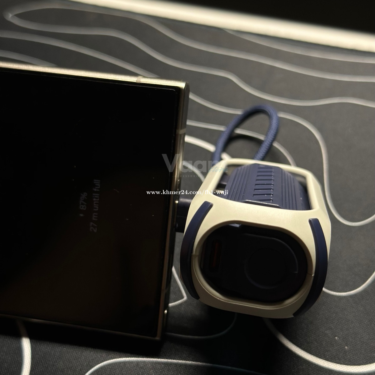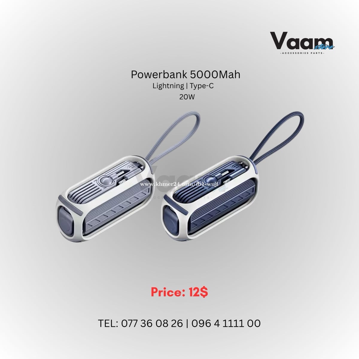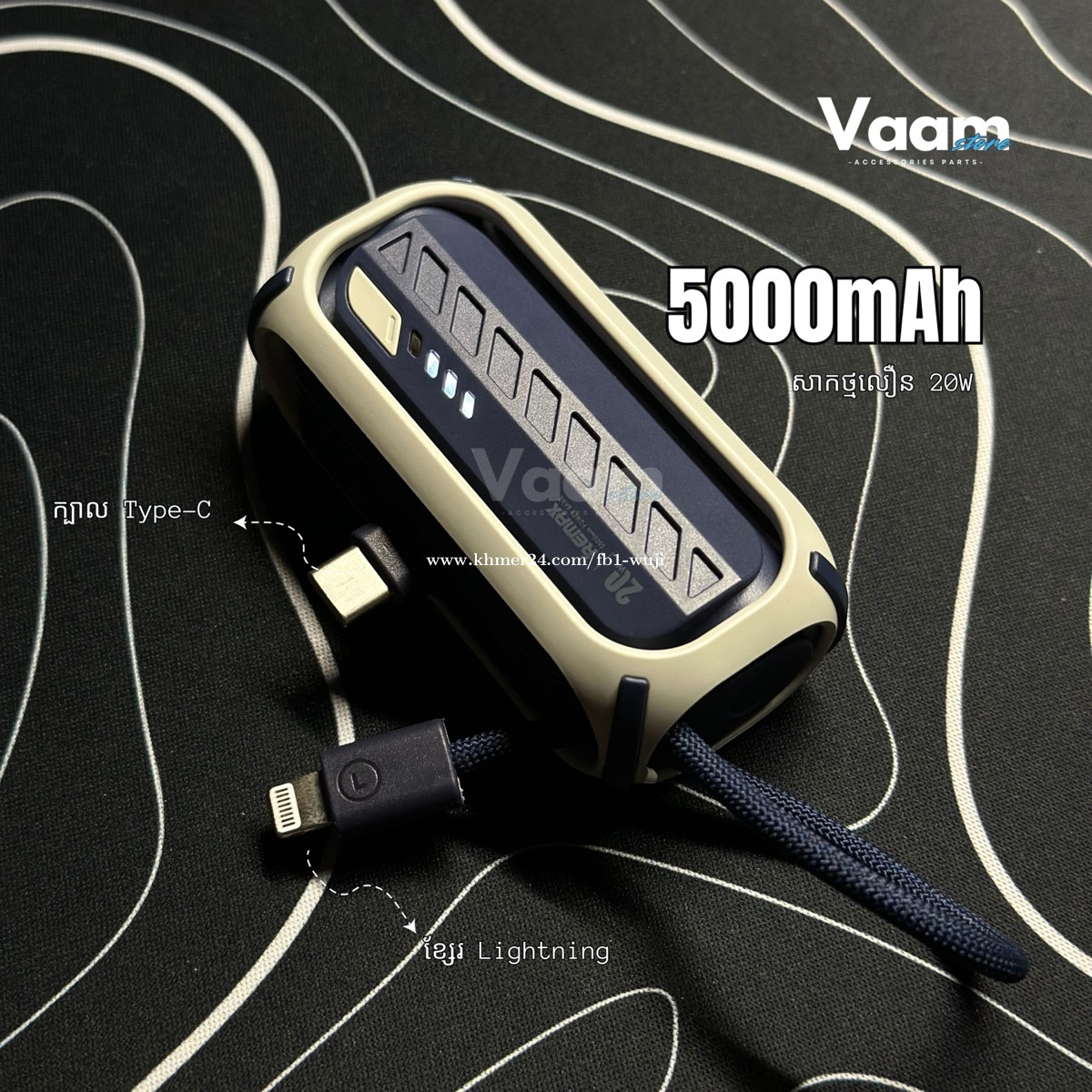 » Power bank ទំហំ 5000mAh. 🔋 » Power bank សាកចេញ 20W. ⚡️ » Output Lightning. » Output/Input Type-C