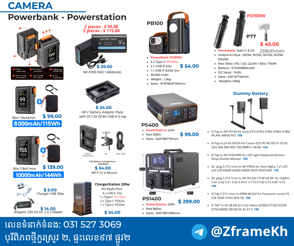 PowerStation 220V 300w ល្អសម្រាប់ប្រើជាមួយអំពូលភ្លើង ១០០វ៉ាត់ ប្រហែល ២ម៉ោង។ 99$ Delivery +24H to PNH, 24/48h in all 25 province មានក្នុងស្ចុកស្រាប់ អាចទាក់ទងមកបានឫ ឆាតមកផេកក៌បាន៕ ហេីយមានលក់ ដូចជា សំភារៈសម្រាប់កាមេរ៉ា កំព្យូរទ័រ មានតម្លៃសមរម្យ: 👉លេខទំនាក់ទំនង: 0315273xxxClick To Call 👉តេលេក្រាម : t.me/ZframeKh 👉បញ្ជីតម្លៃ: t.me/Zframegr 👉https://www.facebook.com/zframekh Google maps : https://g.co/kgs/ukpxkbg 📍បុរីពិភពថ្មីកួរស្រូវ ២, ផ្ទះលេខ៩៧ ផ្លូវ២ 📍Borey New World Kor Srov II, #97 street 2 #zframe #camera #filmmaking #filmmaker #Sony #lumix #blackmagic #nikonphotography #fujifilm #zframekh #sigma #cinema #phnompenh #Cambodia #studio #godox #light #nanlite #aputure #bowensmount #pdmovie #liveair4smart #MOTORSMART #autofocus #followfocus #dulens #filmmaking #cameragears #cinematic #camerasetup #powerbank #powerstation