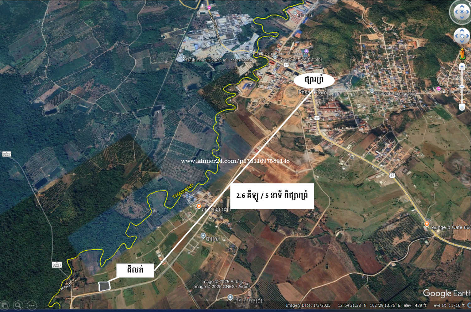 🌏 Strategic Location for Cross-Border Investment Located just a few minutes’ walk from the Cambodia–Thailand border crossing at Phsar Prum, this 5,200 sqm plot sits next to a newly paved wide road leading to Pailin’s most promising emerging commercial and residential area. Ideal for investors seeking opportunities in border trade, logistics, warehousing, or tourism-related development such as hotels, service apartments, or shopping complexes. 📍 Land Size: 5,200 sqm 💰 Price: $1xx/sqm (negotiable) 📞 Contact: +8551683xxxClick To Call1 +8551272xxxClick To Call1 地理位置优越,距柬泰边境仅几分钟步行路程。临近宽阔新铺大道,通往拜林市最具潜力的新兴商业与住宅中心区。 土地面积5,200平方米,非常适合投资用于边境贸易、仓储物流、酒店、公寓或商业综合体开发。 📍 土地面积: 5,200 平方米 💰 价格: 每平方米 $1xx(可议价) 📞 联系方式: +8551683xxxClick To Call1 +8551272xxxClick To Call1