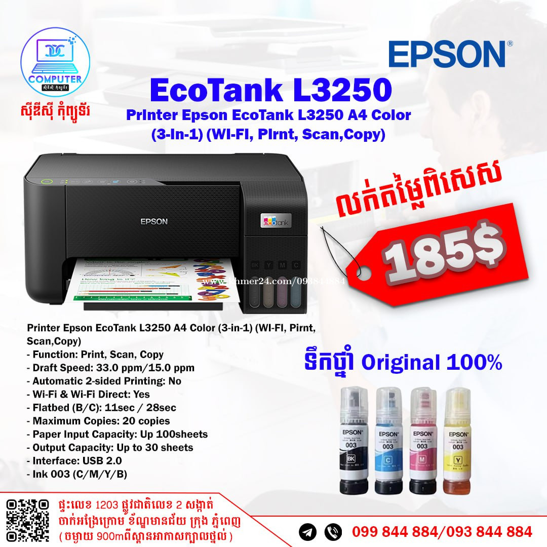 Printer Epson EcoTank L3250 A4 Color (3-in-1) (WI-FI, Pirnt, Scan,Copy) - Function: Print, Scan, Copy - Draft Speed: 33.0 ppm/15.0 ppm - Automatic 2-sided Printing: No - Wi-Fi & Wi-Fi Direct: Yes - Flatbed (B/C): 11sec / 28sec - Maximum Copies: 20 copies - Paper Input Capacity: Up 100sheets - Output Capacity: Up to 30 sheets - Interface: USB 2.0 - Ink 003 (C/M/Y/B) Price 185$ CDC COMPUTER 🖥 ទូរស័ព្ទលេខ ☎️ 093844xxxClick To Call / 099844xxxClick To Call Telegram : t.me/CDCCOMPUTER093 ទីតាំងហាង 🏠 ផ្លូវជាតិលេខ2,ចាក់អង្រែលើ,ខ័ណ្ឌមានជ័យ,ភ្នំពេញ Google map : https://maps.app.goo.gl/R3W9thPP5omgsMaZA
