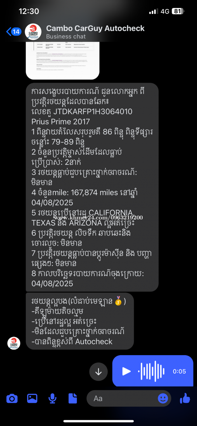 💢 រូបភាពបេីកទូរថយន្ត Prius PRIME 2017 ថ្មីសាហាវ ប្រភេទលំដាប់មេឡាន ស្អាត អត់ច្រេះ អត់ស្ងោរប្តូរពណ៌ អត់កាត់ត 💢 ⚠️ យេីងខ្ញុំមានប្រវត្ត និងរូបនៅអាមេរិកច្បាស់លាស់ ហេីយ ភិនភាគរថយន្តស្អាតខ្លាំងជាមួយតម្លៃពិសេស 📌 ព័ត៌មានលម្អិតនៃរថយន្ត TOYOTA Prius PRIME ឆ្នាំ 2017 ពណ៌ស កាម៉ៃ៖ - ម៉ូឌែល: TOYOTA Prius PRIME - អប់សិន Option: Premium - ឆ្នាំផលិត: 2017 - ពណ៌ៈ ស កាម៉ៃ - តម្លៃ: $30,700 - លក្ខណៈទំនេីបរបស់រថយន្ត៖ > កម្រិតស៊ីសាំង: 100 គីឡូម៉ែត្រ ស៊ី 3.5 លីត្រ ទៅ 4 លីត្រ > សាកថ្មមួយពេញប្រេីពេល 2ម៉ោងកន្លះទៅ3ម៉ោង ហេីយជិះបាន 35 គីឡូម៉ែត្រ > ប្រព័ន្ធសាកថ្មទូរស័ព្ទដោយអត់ប្រេីខ្សែរ (Wireless Charge) > អេក្រង់កំសាន្តធំ ទំហំ 11.6 អ៉ីង > ប្រព័ន្ធចាប់ហ្វ្រាំងអូតូ (Brake Assist) > ប្រព័ន្ធទម្លាក់ភ្លេីងដោយស្វ័យប្រវត្តិ (Auto High Beam) > ប្រព័ន្ធរក្សារគន្លងផ្លូវ (Lane Keeping Assist LKA) > ប្រព័ន្ធផ្តល់សញ្ញាពេលងាកចេញពីគន្លងផ្លូវ (Lane Departure Warning) > ប្រព័ន្ធរក្សារគម្លាតពីឡានខាងមុខ (Adaptive Cruise Control) > បញ្ជាបញ្ឆេះម៉ាស៊ីនត្រជាក់ពីចម្ងាយ ⚙️ ធានាម៉ាស៊ីន ប្រអប់លេខ អាគុយហាយប្រីត ABS និង ប្រព័ន្ធភ្លេីង រយៈពេល 30 ថ្ងៃ 🏠 អាស័យដ្ឋានឃ្លាំង: ផ្ទះលេខ75F ខ័ណ្ឌឬស្សីកែវ រាជធានីភ្នំពេញ 📱 លេខទូរស័ព្ទទំនាក់ទំនងៈ 0963219xxxClick To Call / 0966515xxxClick To Call