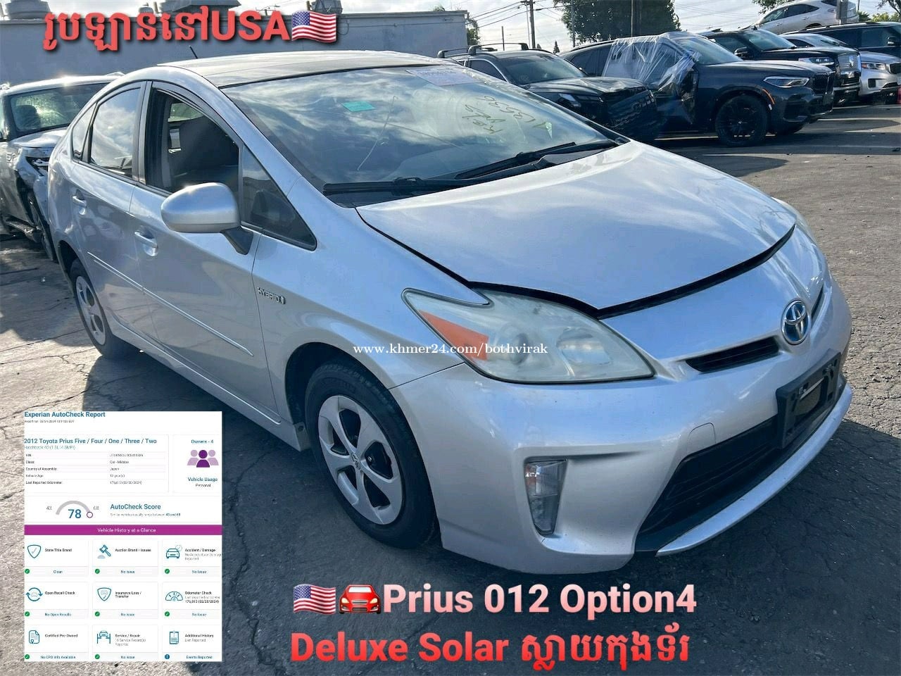 prius2012 option4 សឡា Deluxe solar ស្លាយកុងទ័រ អេក្រង់ធំJBL smart keyទ្វារ៣ កៅអីចុច កំដៅកៅអី ពូកស្បែកទន់ ម្ចាស់ដើមទី១ ផ្លាកលេខ2CB-99xxភ្នំពេញ ទើបប្រើបានជាង១ឆ្នាំ ឡានកាលី កង់ថ្មី៤គ្រាប់ camera record មុខក្រោយ បំពាក់ចង្កៀងគុជភ្លោះ ដុំបញ្ជាភ្លើងរេឡើងចុះ ឡាននៅថ្មី ជិះហាប់ណែន យកទៅប្រើប្រាស់តែម្តង auto check77 ស៊ីមាំងឃ្មុំហ្សីន ចំណាយរៀបចំឡានក្រដាសពន្ធសំរាប់ជិះ ១.បំពាក់គុជភ្លោះ២គូរ+គំរប+កុងតាក់បញ្ជារភ្លើងឡើងចុះ=410$ ២.ធ្វើលេខវែងរើសលេខ=330$ ៣.ប្តូរកង់៤គ្រាប់=240$ ៤.ប្តូរទឹកស្អំ ប្តូរប្រេងប្រាំង =85$ ៥.បំពាក់cameraDDpaiZ50 128G=139$ ៦.កល់បូម កៅស៊ូបូម ដូររ៉ូទីល ផ្លិតទឹក=71$ _____ សរុប : 1275$