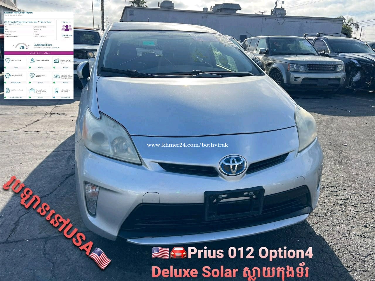 prius2012 option4 សឡា Deluxe solar ស្លាយកុងទ័រ អេក្រង់ធំJBL smart keyទ្វារ៣ កៅអីចុច កំដៅកៅអី ពូកស្បែកទន់ ម្ចាស់ដើមទី១ ផ្លាកលេខ2CB-99xxភ្នំពេញ ទើបប្រើបានជាង១ឆ្នាំ ឡានកាលី កង់ថ្មី៤គ្រាប់ camera record មុខក្រោយ បំពាក់ចង្កៀងគុជភ្លោះ ដុំបញ្ជាភ្លើងរេឡើងចុះ ឡាននៅថ្មី ជិះហាប់ណែន យកទៅប្រើប្រាស់តែម្តង auto check77 ស៊ីមាំងឃ្មុំហ្សីន ចំណាយរៀបចំឡានក្រដាសពន្ធសំរាប់ជិះ ១.បំពាក់គុជភ្លោះ២គូរ+គំរប+កុងតាក់បញ្ជារភ្លើងឡើងចុះ=410$ ២.ធ្វើលេខវែងរើសលេខ=330$ ៣.ប្តូរកង់៤គ្រាប់=240$ ៤.ប្តូរទឹកស្អំ ប្តូរប្រេងប្រាំង =85$ ៥.បំពាក់cameraDDpaiZ50 128G=139$ ៦.កល់បូម កៅស៊ូបូម ដូររ៉ូទីល ផ្លិតទឹក=71$ _____ សរុប : 1275$